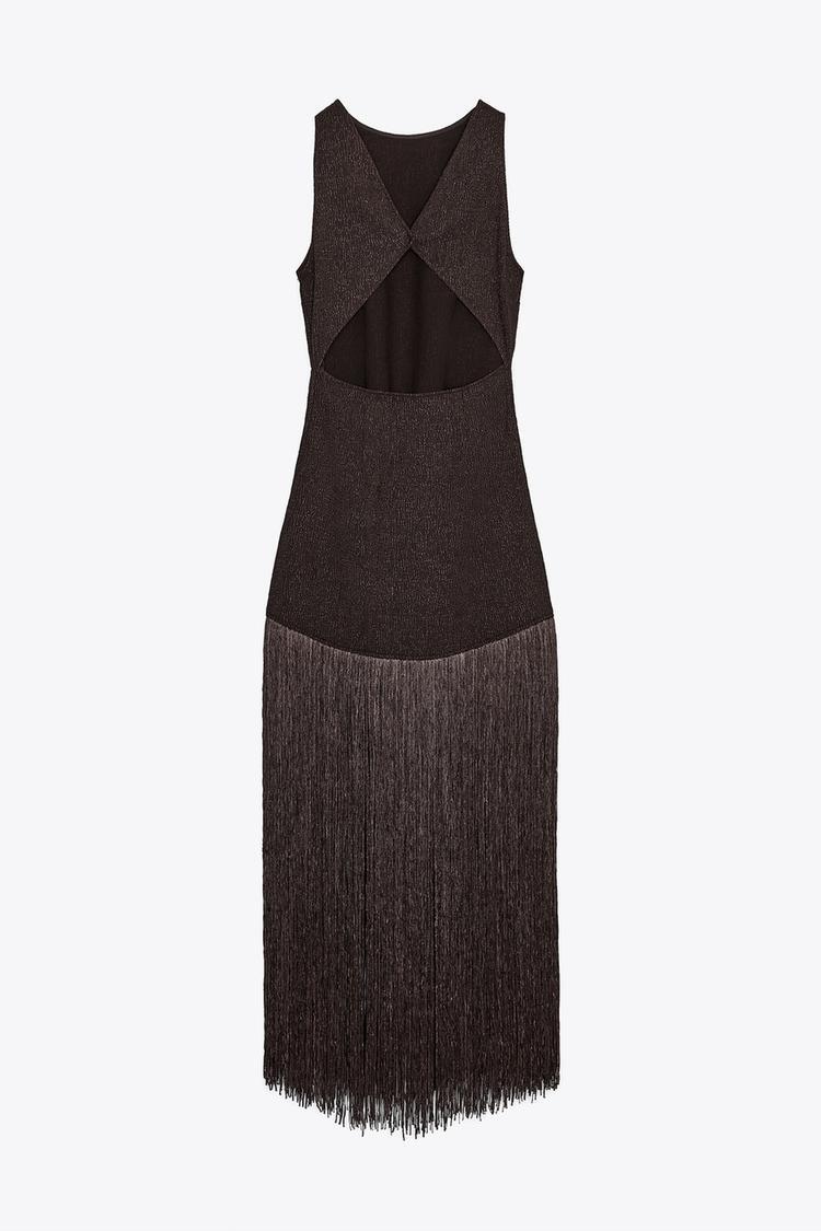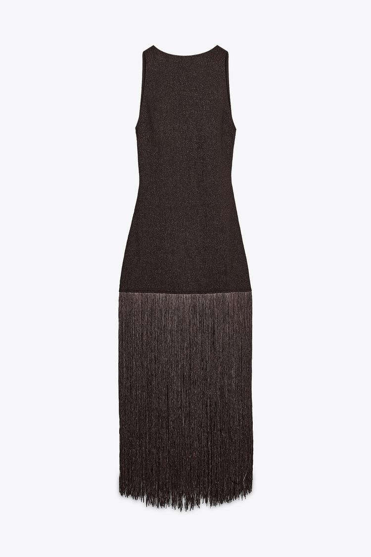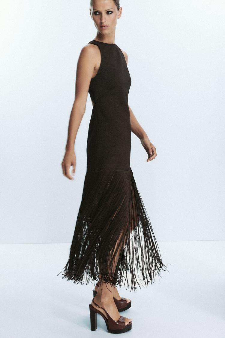 ZARA ПРИТАЛЕННОЕ ПЛАТЬЕ С БАХРОМОЙ, КОРИЧНЕВЫЙ