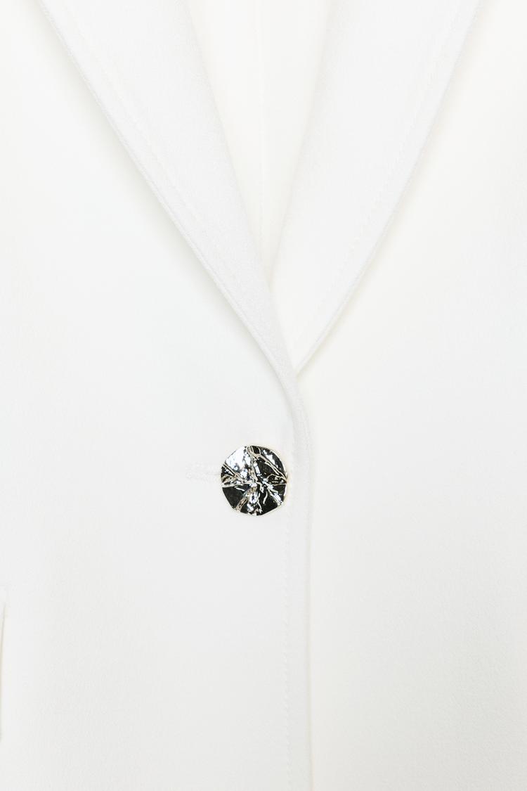 Блейзер с воротником с лацканами и длинными рукавами со складками на плечах. Декоративные передние карманы с клапанами. Застежка на одну пуговицу спереди.