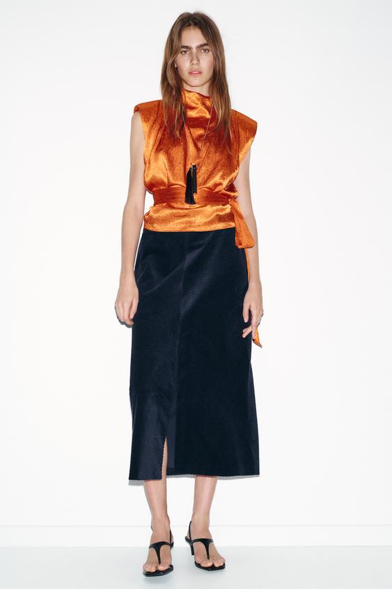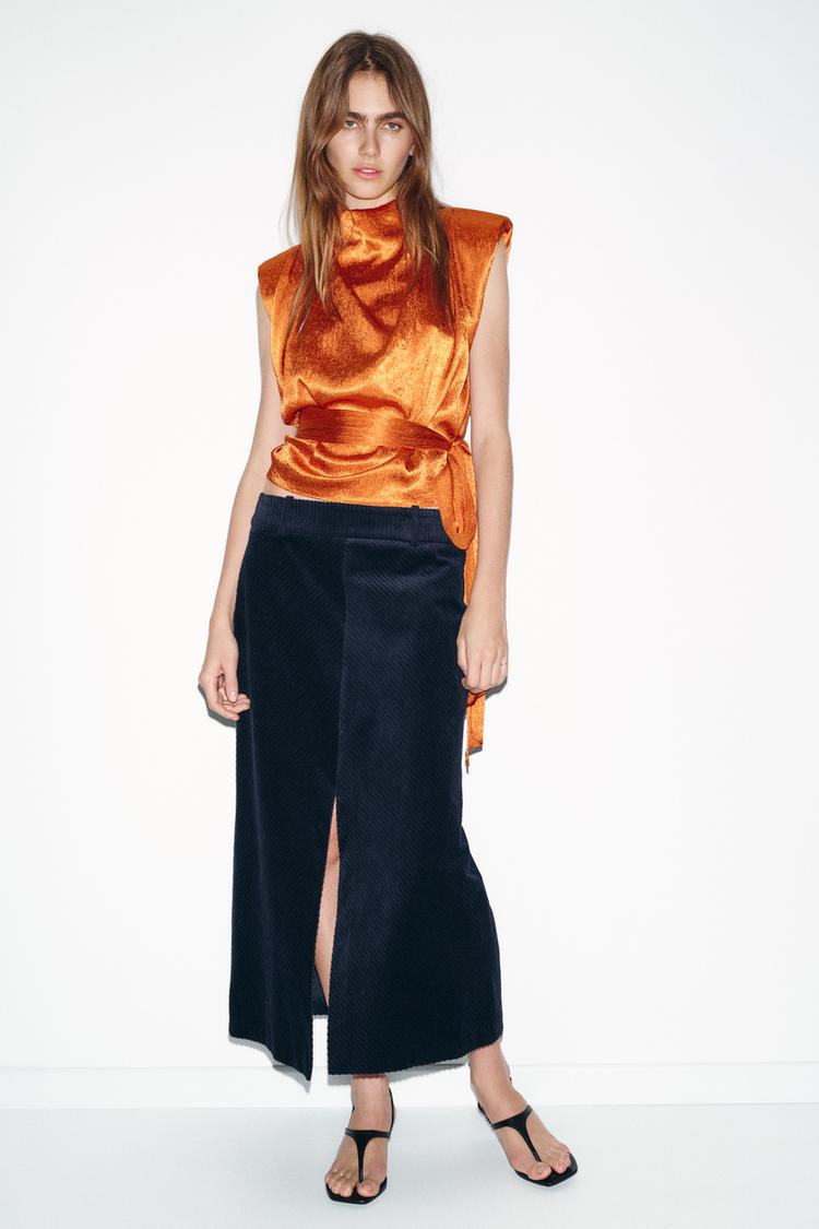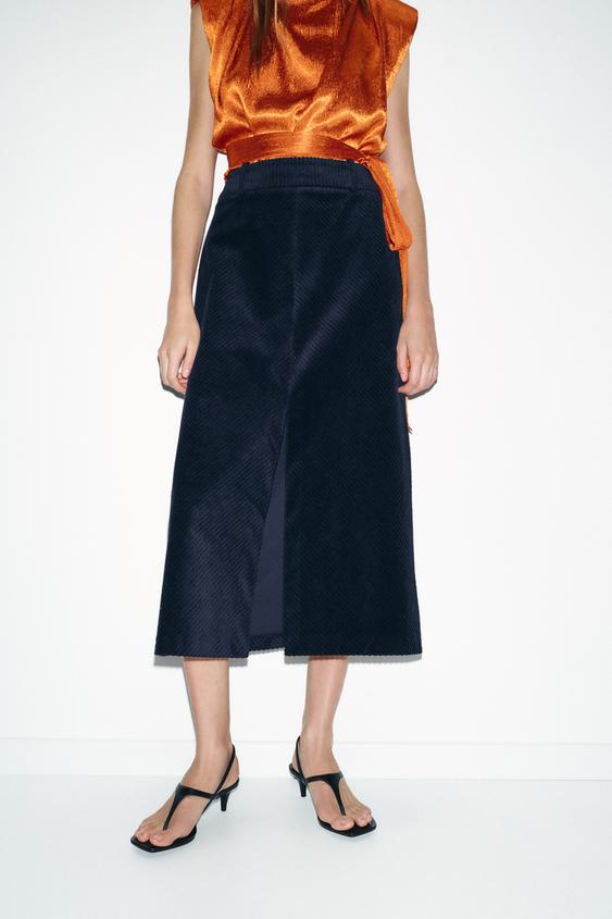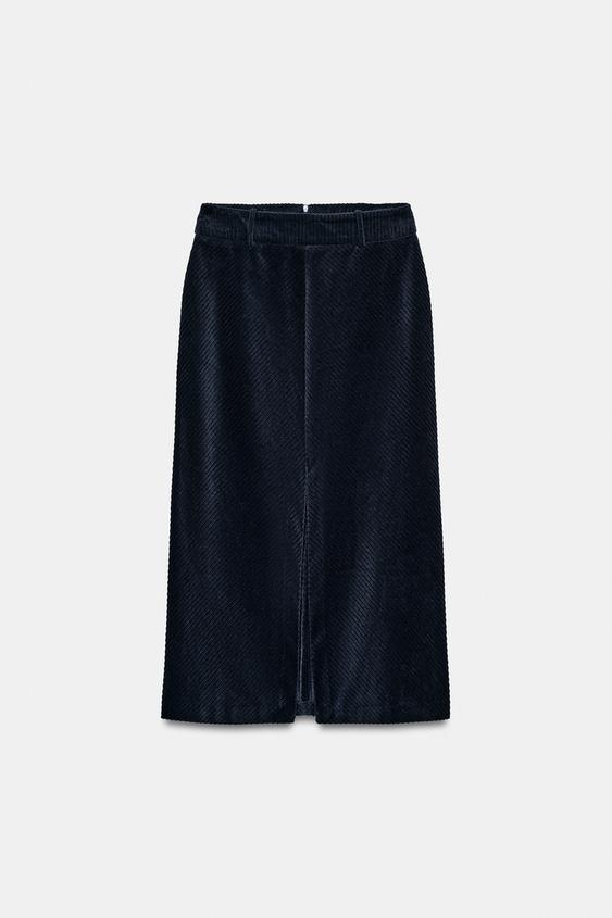 ZARA ПРЯМАЯ ЮБКА МИДИ ИЗ ВЕЛЬВЕТА, МОРСКОЙ СИНИЙ