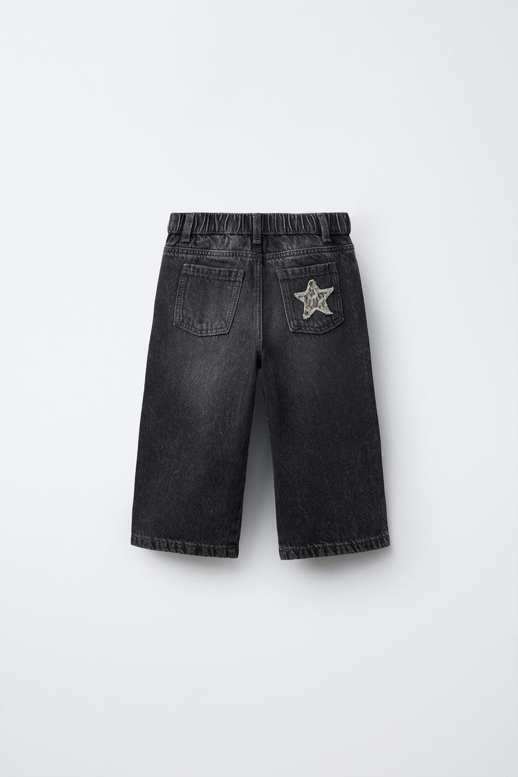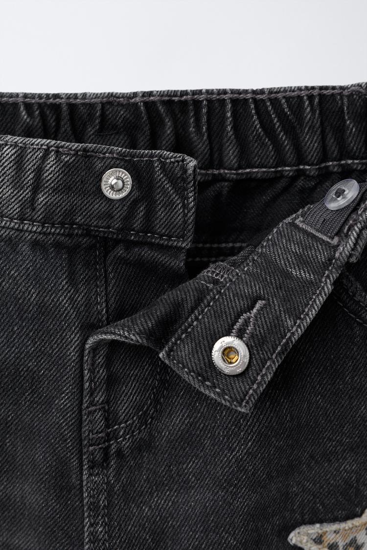 ZARA ПРЯМЫЕ ДЖИНСЫ С ЗАПЛАТКАМИ В ВИДЕ ЗВЕЗД И АНИМАЛИСТИЧЕСКИМ ПРИНТОМ, ЧЕРНЫЙ