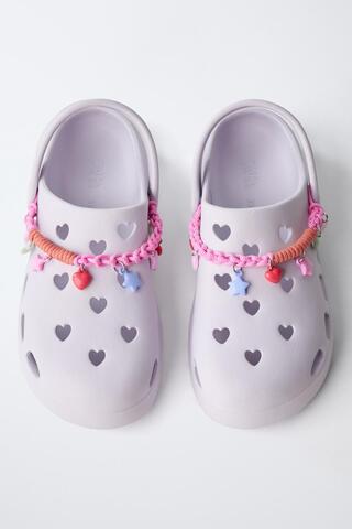 Резиновые сабо для душа с сердцами и шармами на подъеме. Сзади ремешок для лучшей фиксации. Резиновая подошва.