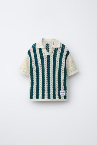 Трикотажное поло с воротником поло и короткими рукавами. Этикетка спереди и нашивка сзади. Принт в полоску.