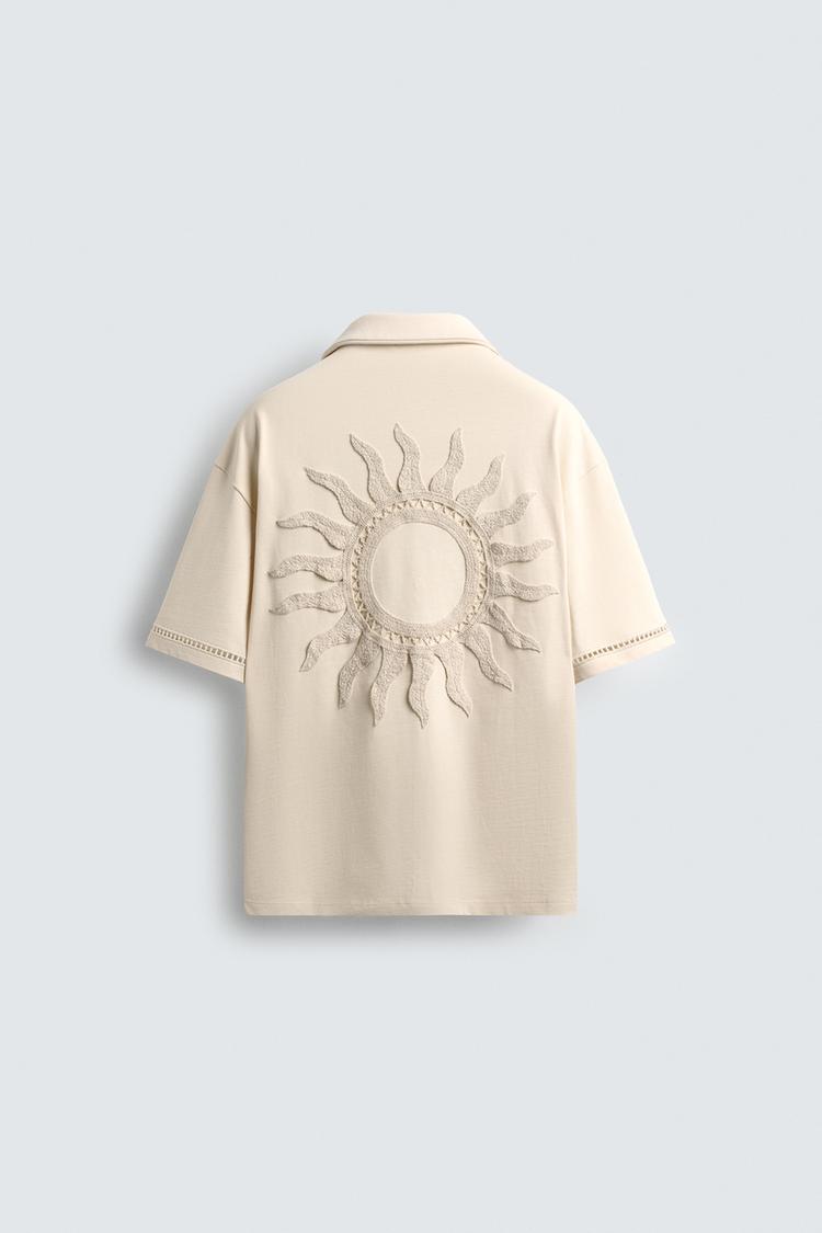 Рубашка свободного кроя из плотной эластичной ткани. Отложной воротник и короткие рукава с открытой вышивкой. Сзади нашивка с вышивкой в тон. Застегивается на пуговицы.