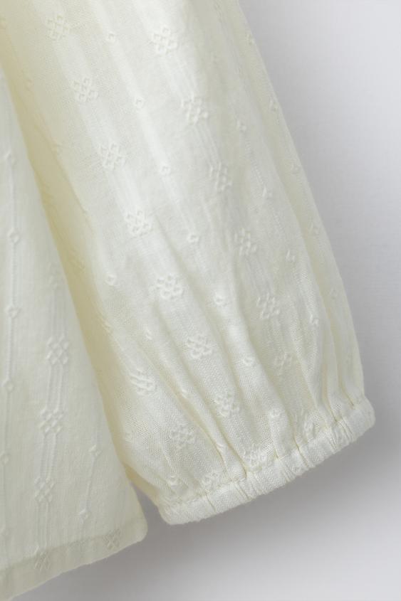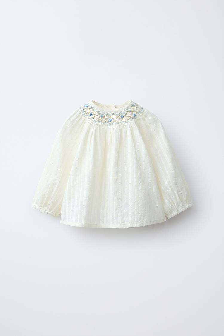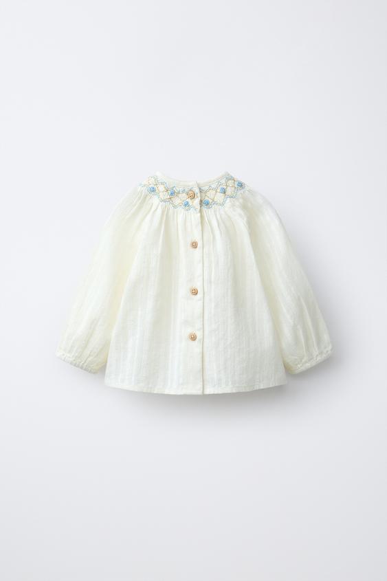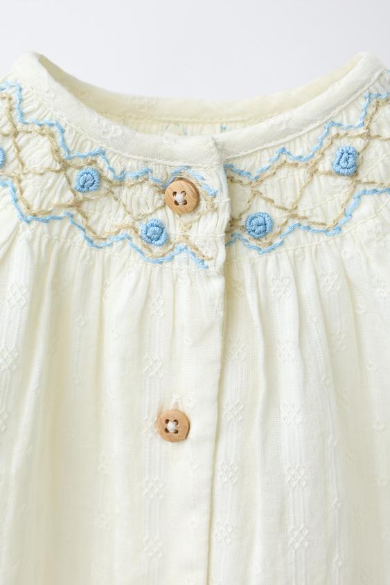 Рубашка с круглым вырезом и длинными рукавами на резинке. Застежка на пуговицы сзади. Декоративная вышивка.