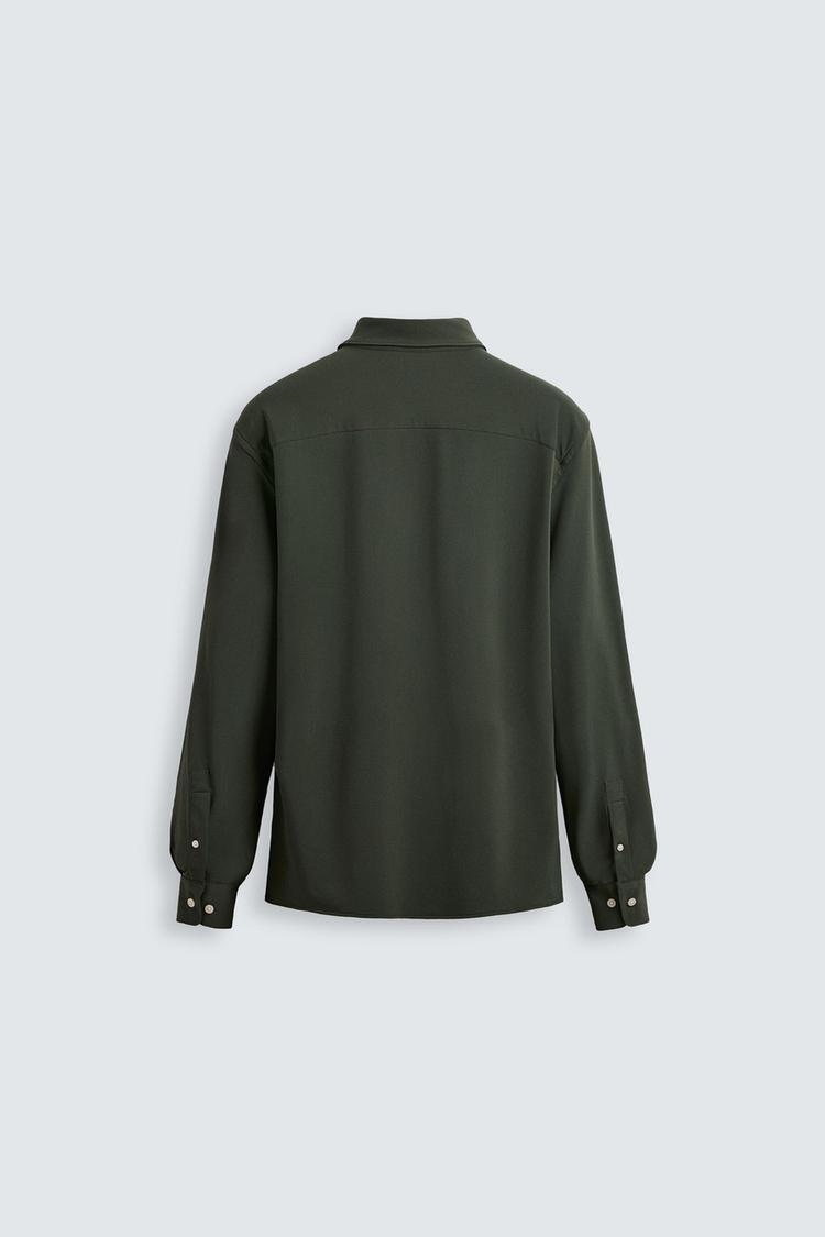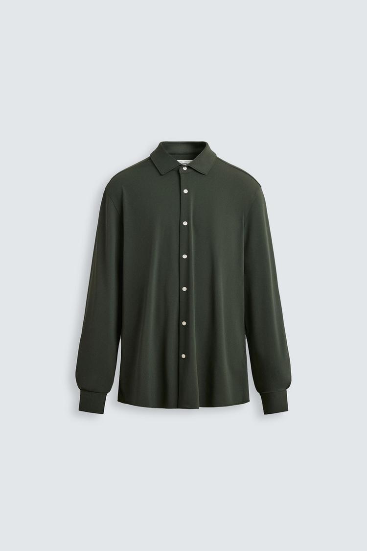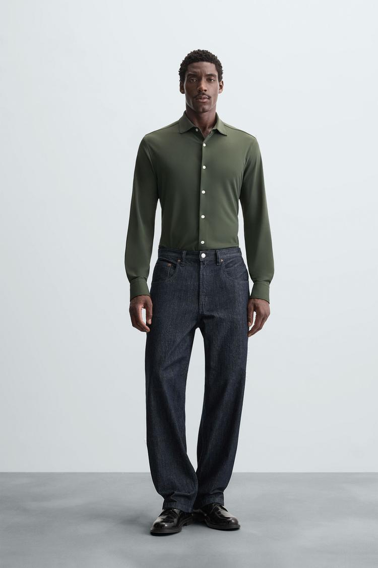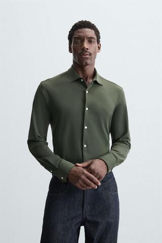 Рубашка облегающего кроя из ткани, которая требует минимум глажки после стирки. Открытый широкий воротник. Длинные рукава, манжеты с пуговицами. Застегивается на пуговицы.