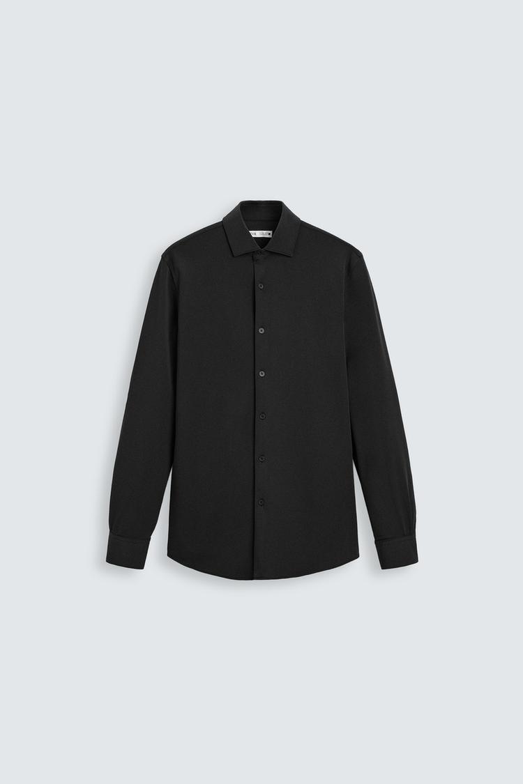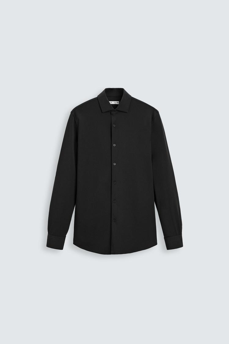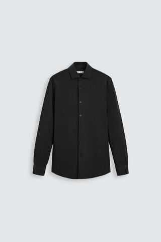 Рубашка облегающего кроя из ткани, которая требует минимум глажки после стирки. Открытый широкий воротник. Длинные рукава, манжеты с пуговицами. Застегивается на пуговицы.
