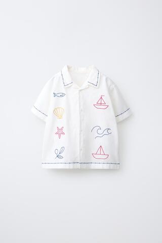 Рубашка с отложным воротником и короткими рукавами. Застегивается на пуговицы. Контрастная вышивка. Изготовлена из 80% хлопка и 20% льна.