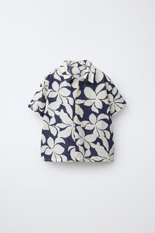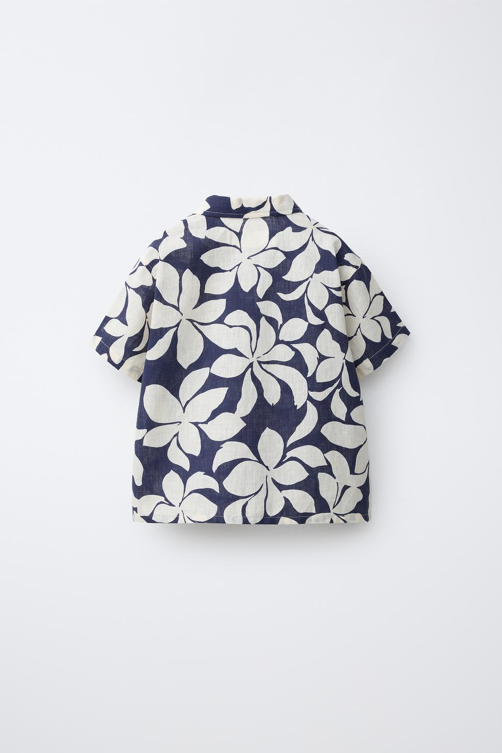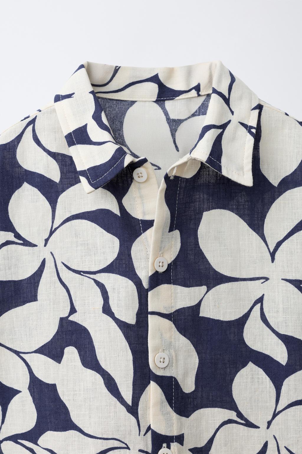 ZARA РУБАШКА ИЗ ХЛОПКА И ЛЬНА С ЦВЕТОЧНЫМ ПРИНТОМ, МОРСКОЙ СИНИЙ