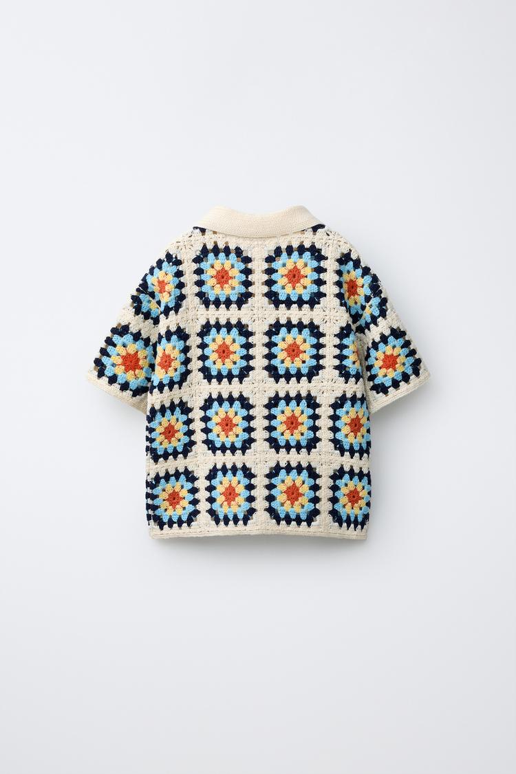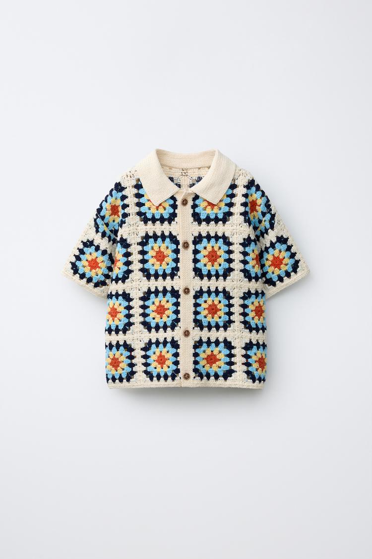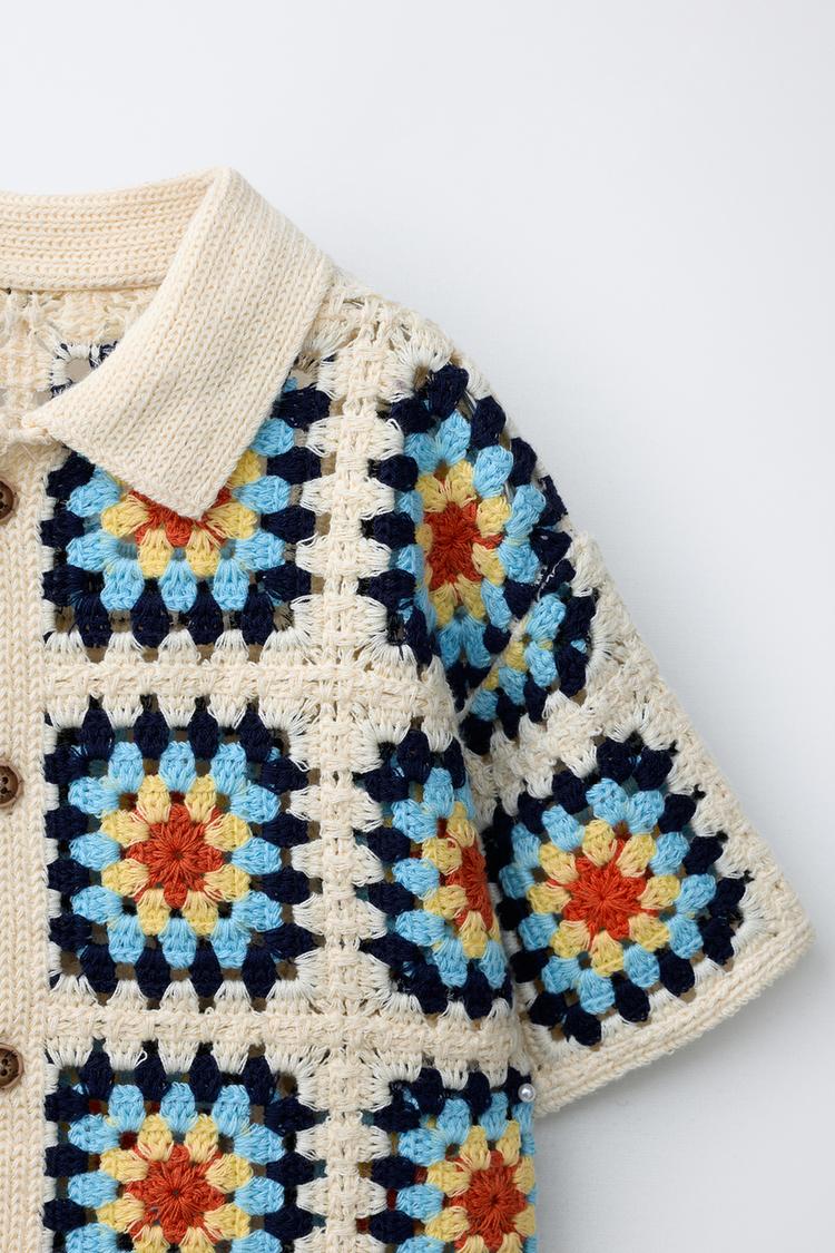 Вязаная рубашка с воротником и короткими рукавами. Застежка на пуговицах спереди. Детали из кружева кроше.