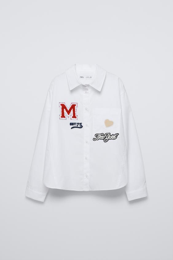 ZARA РУБАШКА ИЗ ПОПЛИНА С НАШИВКАМИ В СТИЛЕ ПРЕППИ, БЕЛЫЙ