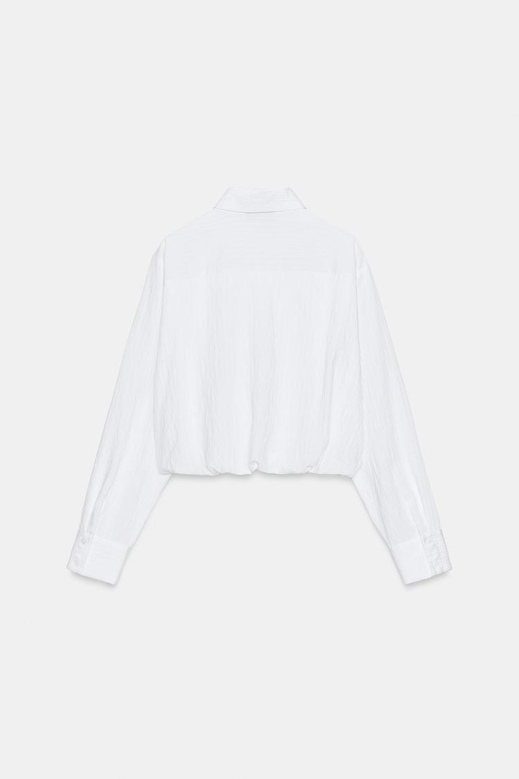 Укороченная рубашка с отложным воротником и длинными рукавами. Объемный низ с внутренней резинкой. Застежка на пуговицы спереди.