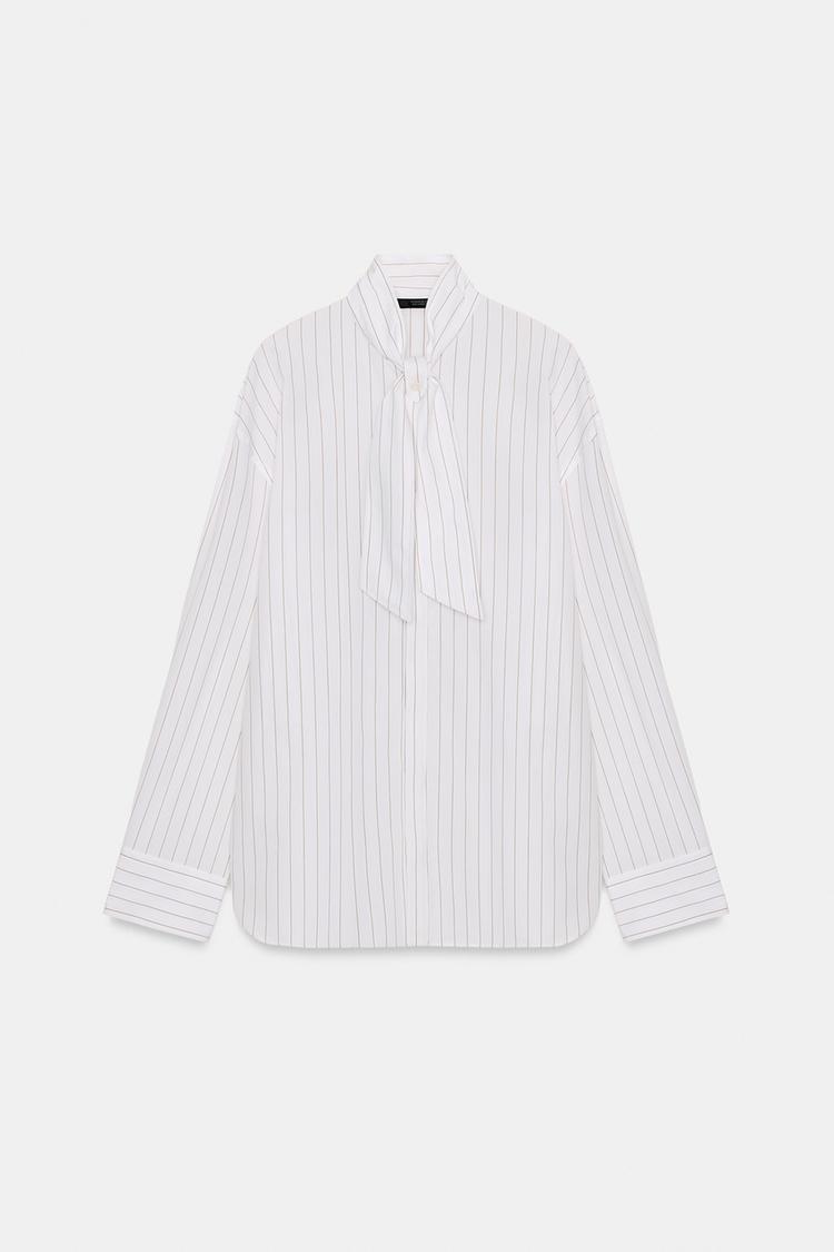 ZARA РУБАШКА ИЗ ПОПЛИНА В ПОЛОСКУ С ШАРФОМ, КОРИЧНЕВЫЙ/БЕЛЫЙ