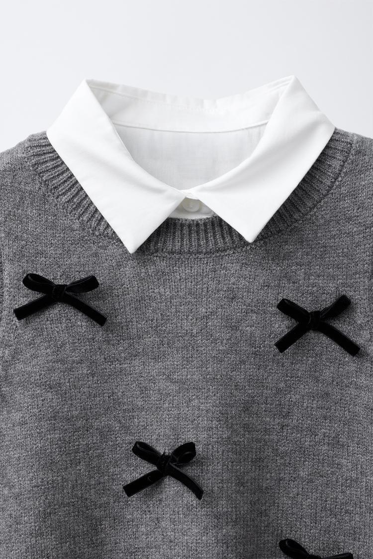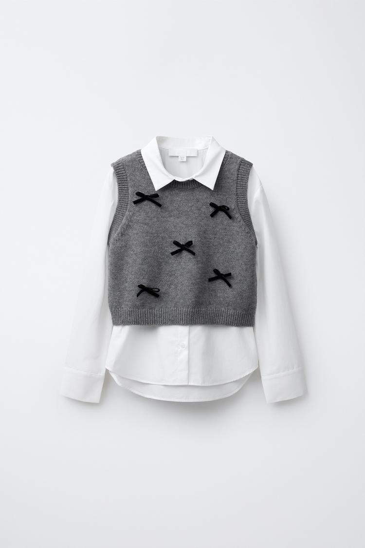 ZARA РУБАШКА ИЗ ПОПЛИНА, ВЯЗАНЫЙ ЖИЛЕТ И БАРХАТНЫЕ БАНТЫ, БЕЛЫЙ/СЕРЫЙ