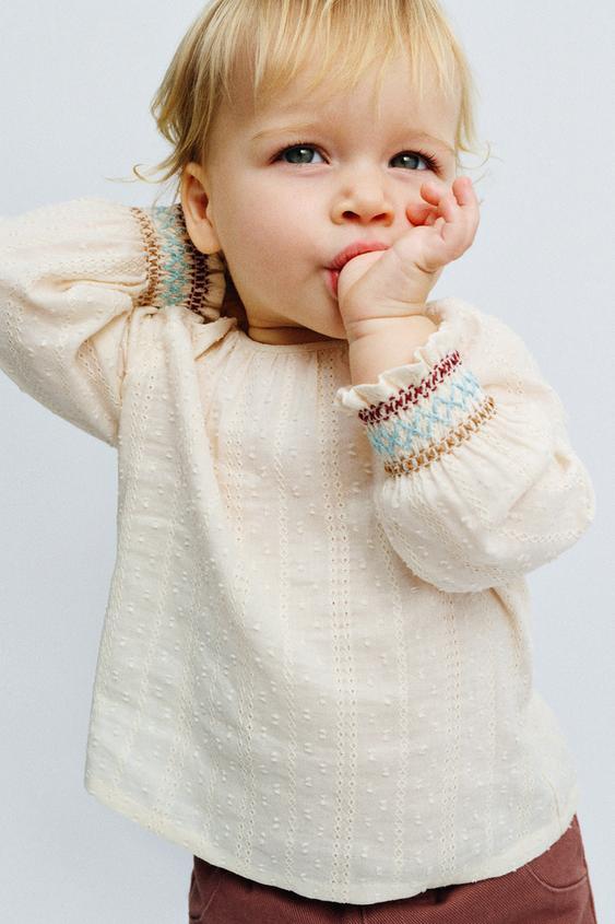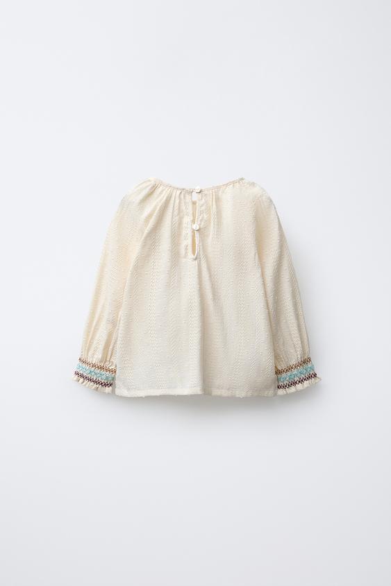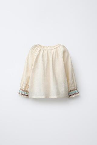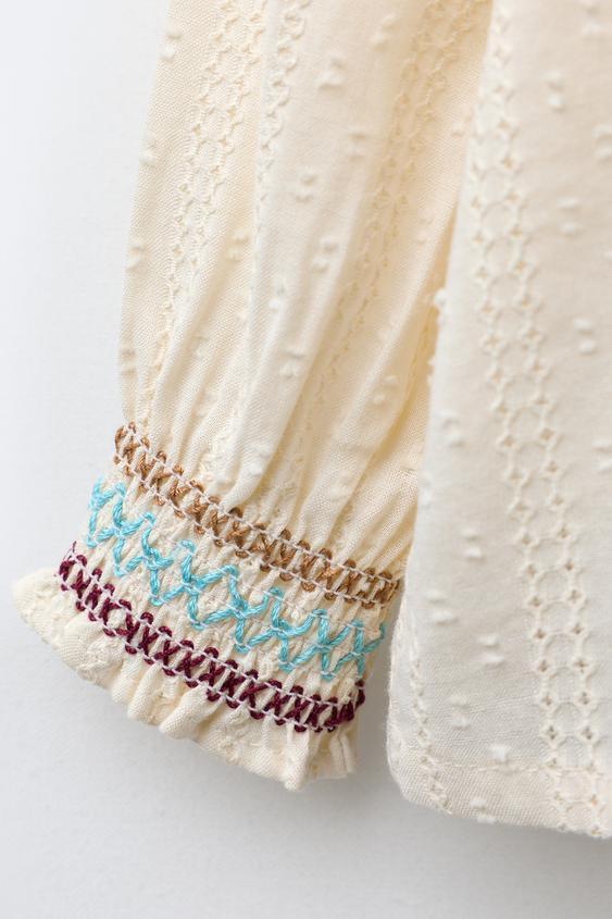 ZARA РУБАШКА ИЗ СЕТЧАТОЙ ТКАНИ В ГОРОШЕК С ВЫШИВКОЙ, ЭКРЮ