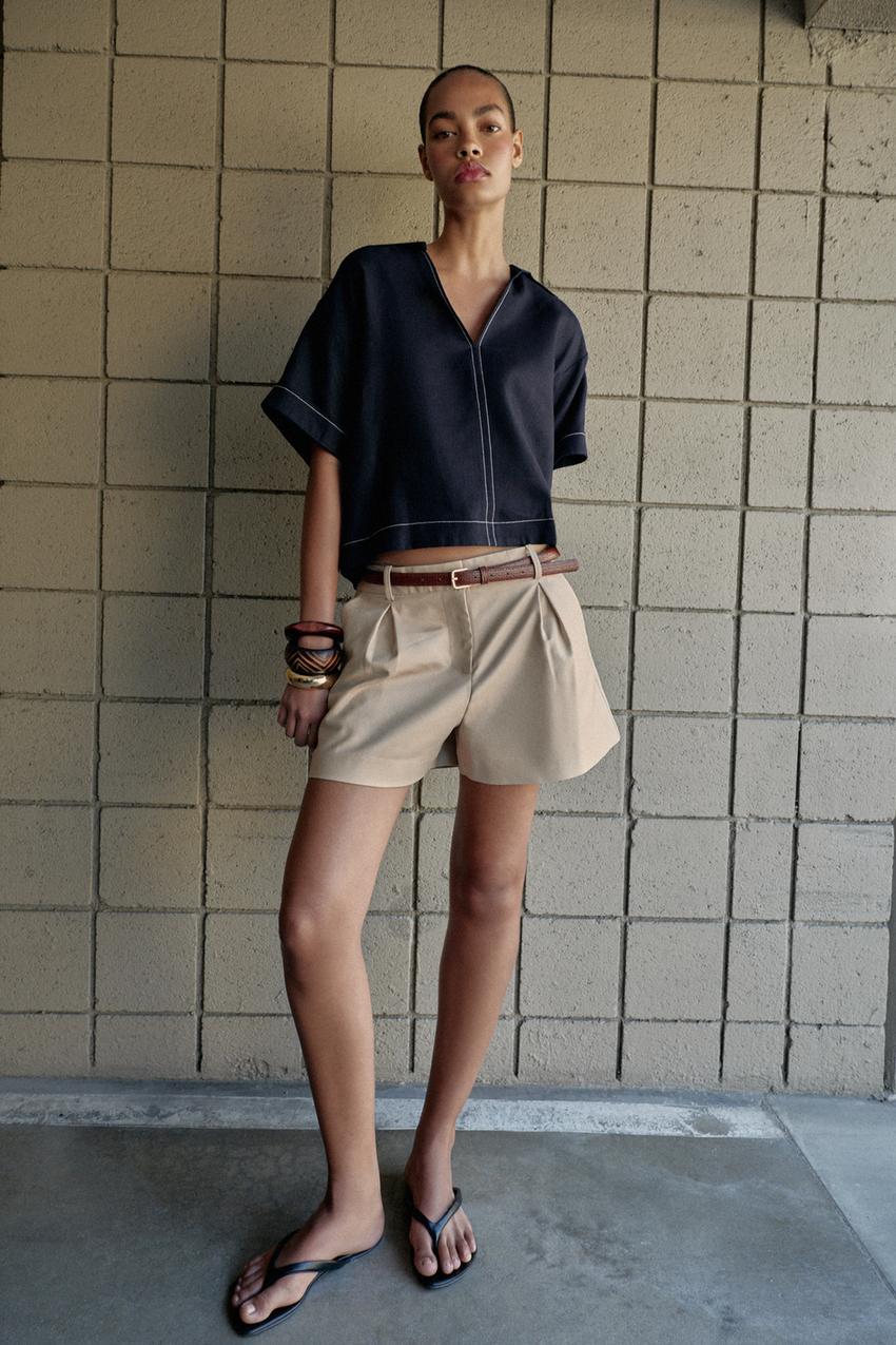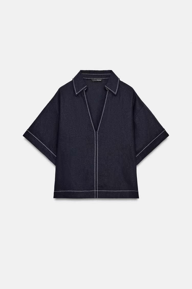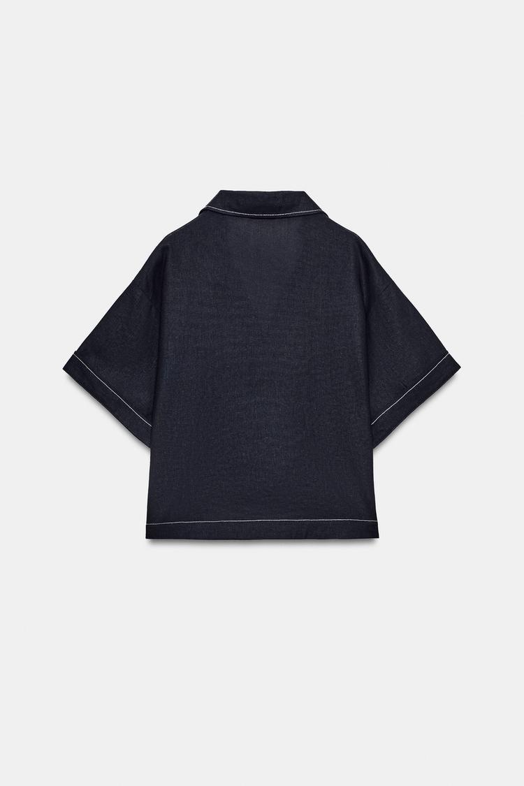 ZARA РУБАШКА ИЗ СМЕСОВОГО ЛЬНА С КОНТРАСТНЫМИ ШВАМИ, МОРСКОЙ СИНИЙ