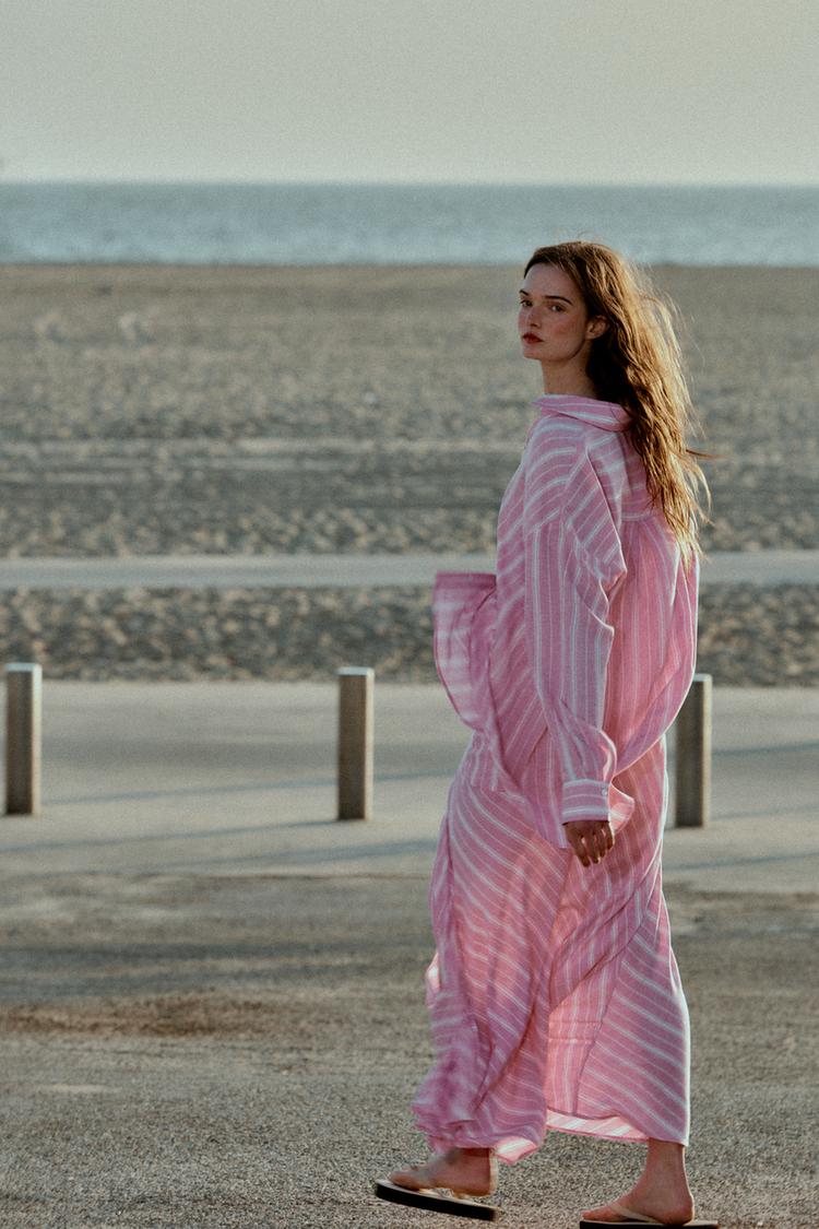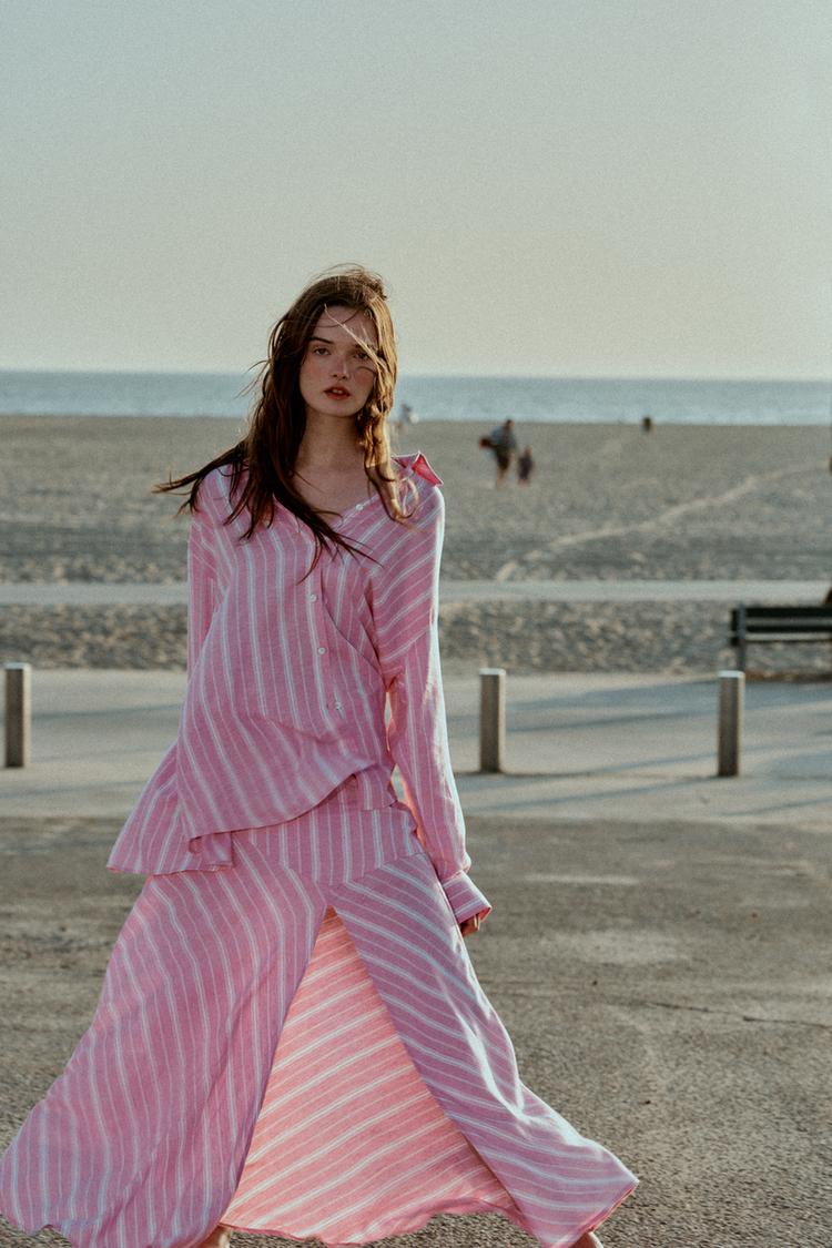 ZARA РУБАШКА ОВЕРСАЙЗ ИЗ ЛЬНА В ПОЛОСКУ, РОЗОВЫЙ/БЕЛЫЙ