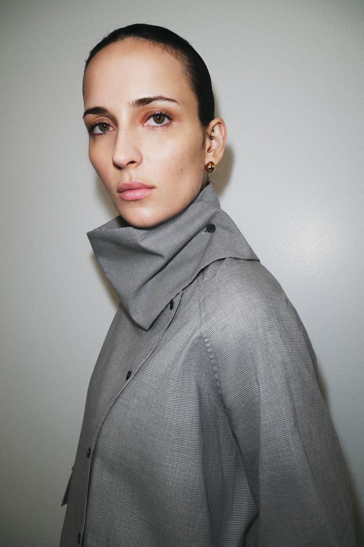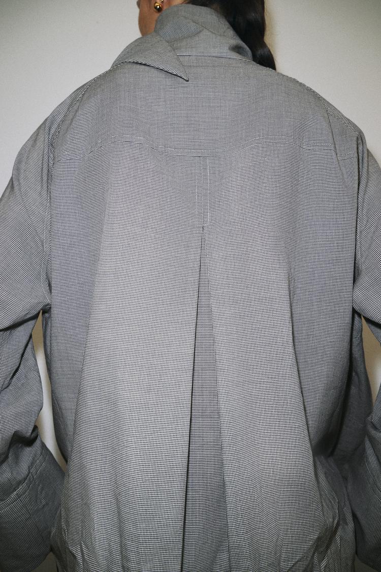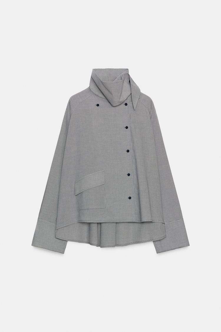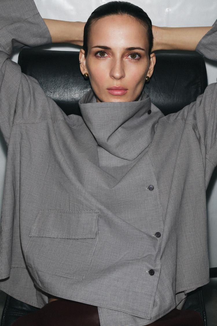 Рубашка оверсайз из 100% хлопка. Воротник-стойка с накладкой из габардина, регулируемой пуговицей. Длинные рукава с манжетами. Нагрудный карман с клапаном. Асимметричный низ. Спереди перекрестная застежка на пуговицах.