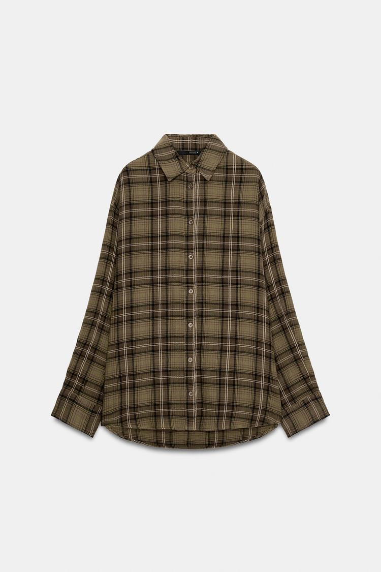 ZARA РУБАШКА OVERSIZE В КЛЕТКУ, СВЕТЛО-КОРИЧНЕВЫЙ