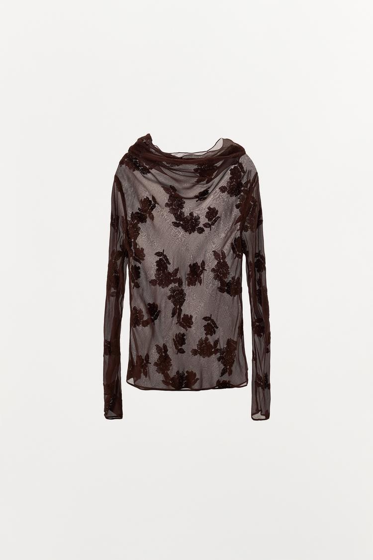 ZARA РУБАШКА ПОЛУПРОЗРАЧНАЯ С ЦВЕТОЧНОЙ ВЫШИВКОЙ, КОРИЧНЕВЫЙ