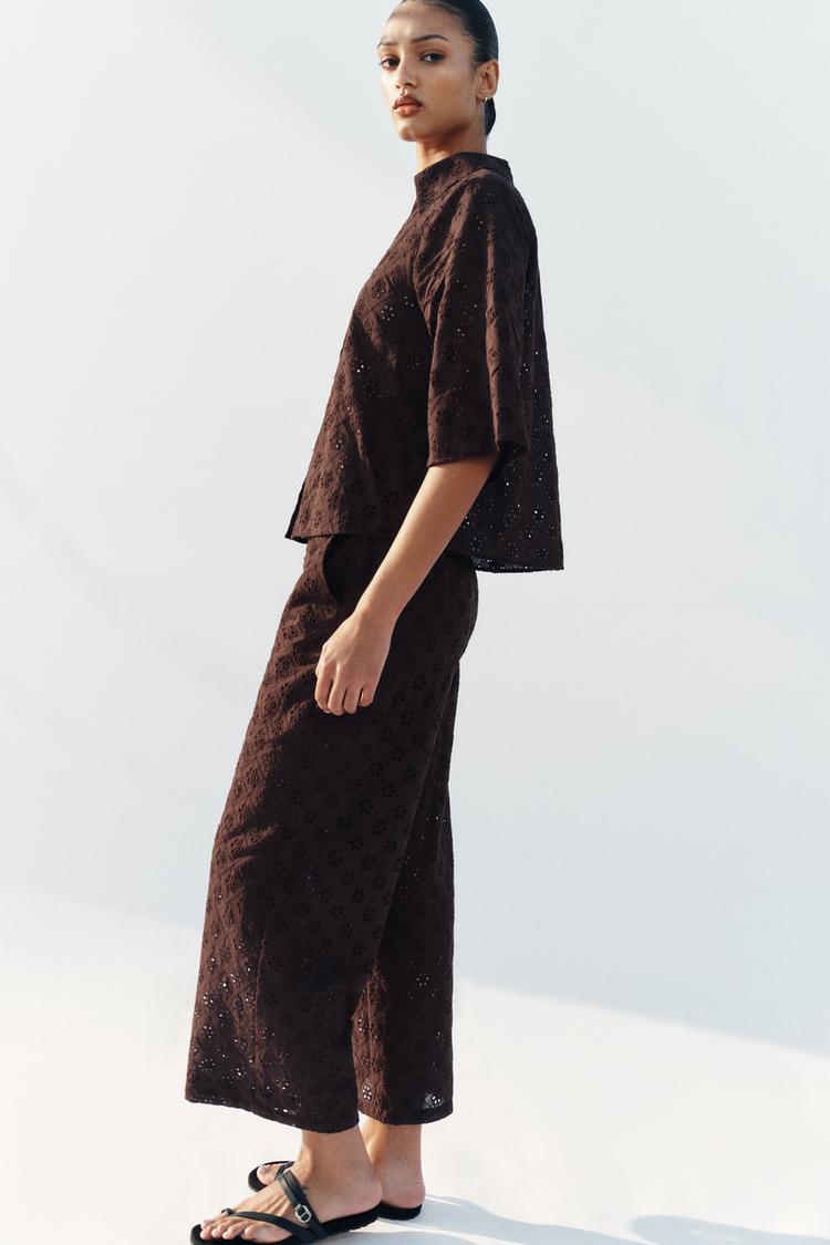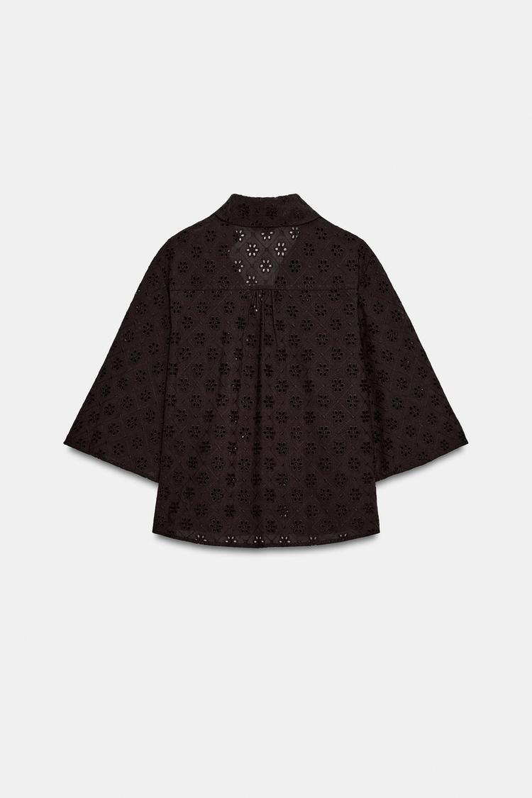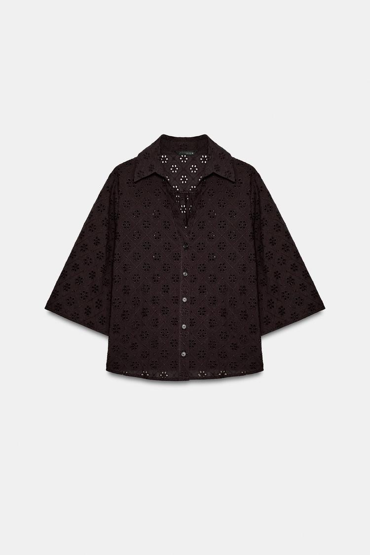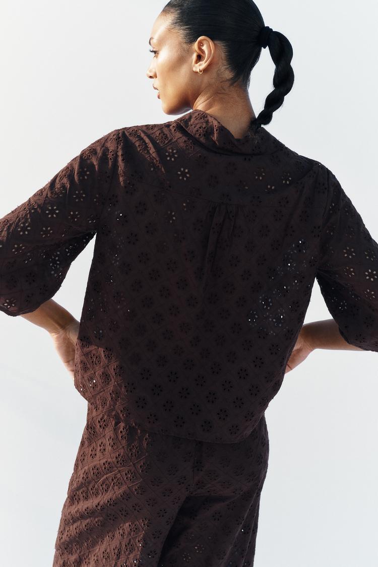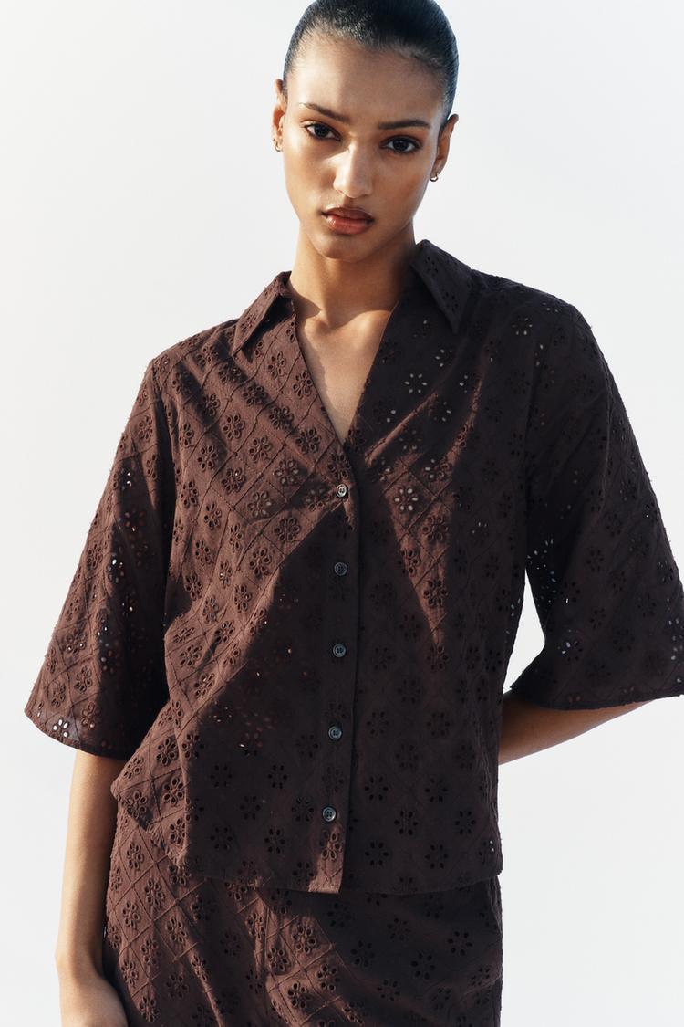 ZARA РУБАШКА С АЖУРНОЙ ВЫШИВКОЙ, КОРИЧНЕВЫЙ