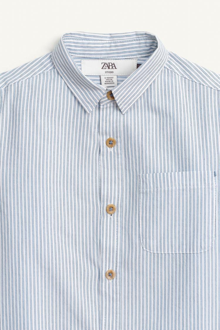 Рубашка с длинными рукавами, манжетами на пуговицах и воротником-стойкой. Спереди на пуговицах, с накладными карманами на груди и в полоску.