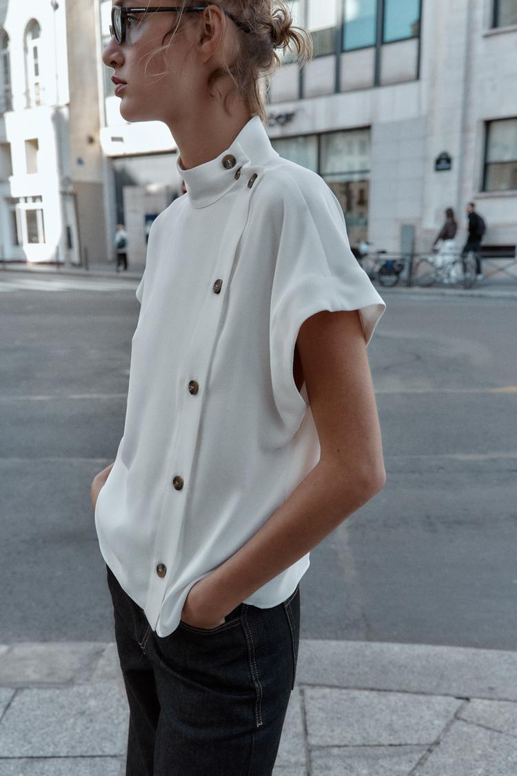 ZARA РУБАШКА С КОНТРАСТНЫМИ ПУГОВИЦАМИ, ЖЕЛТОВАТО-БЕЛЫЙ