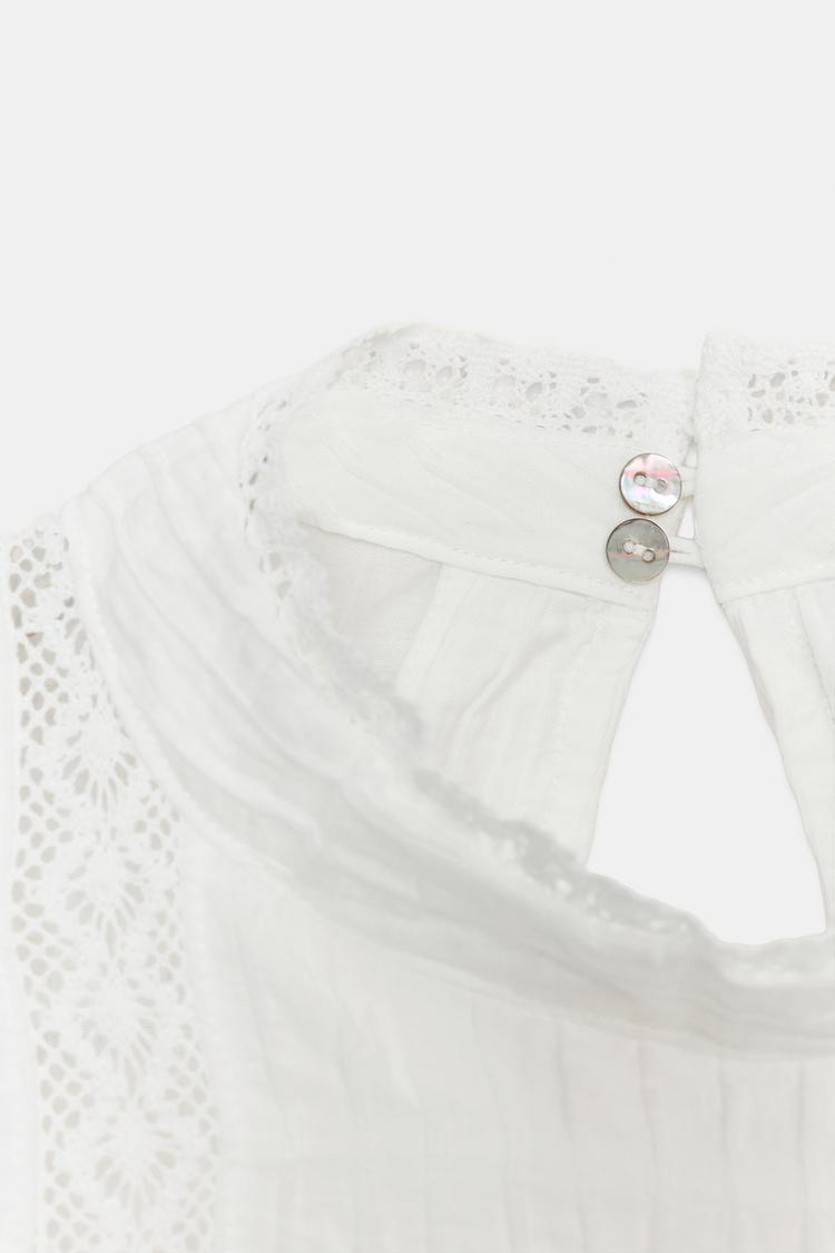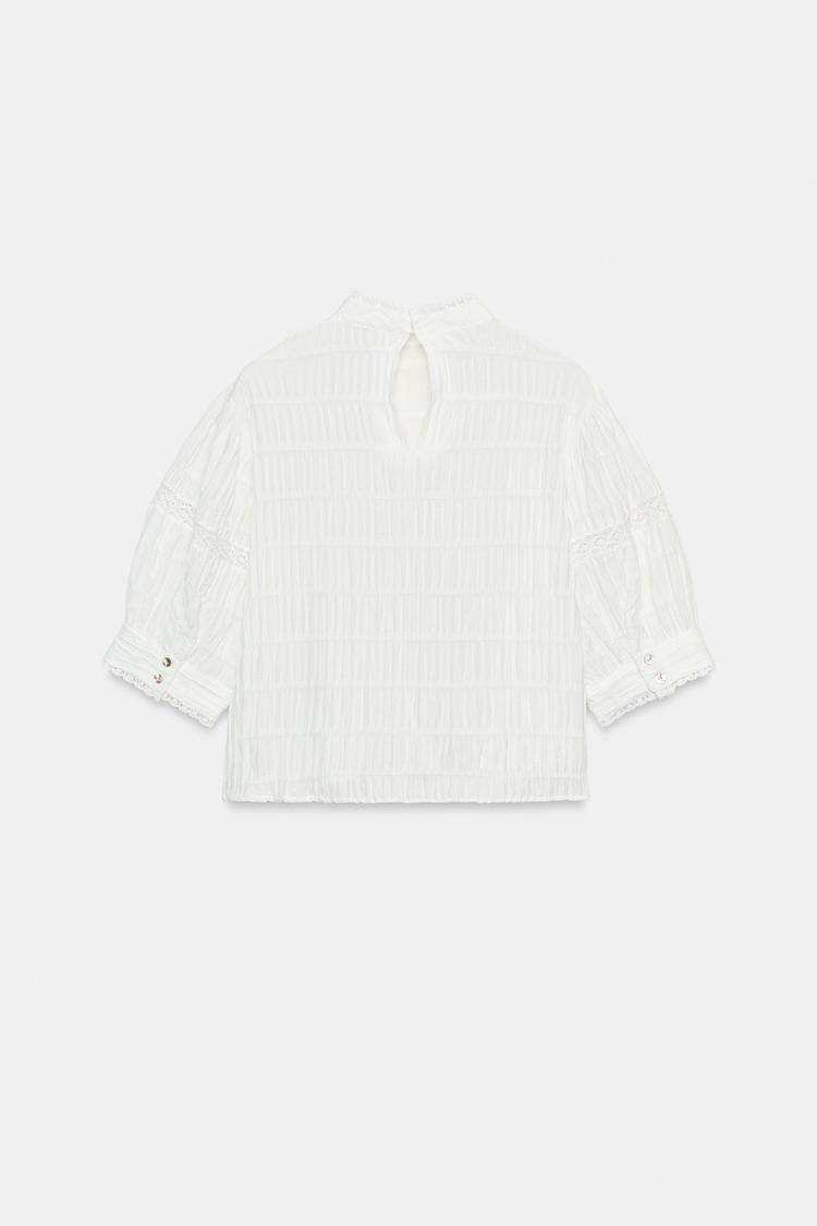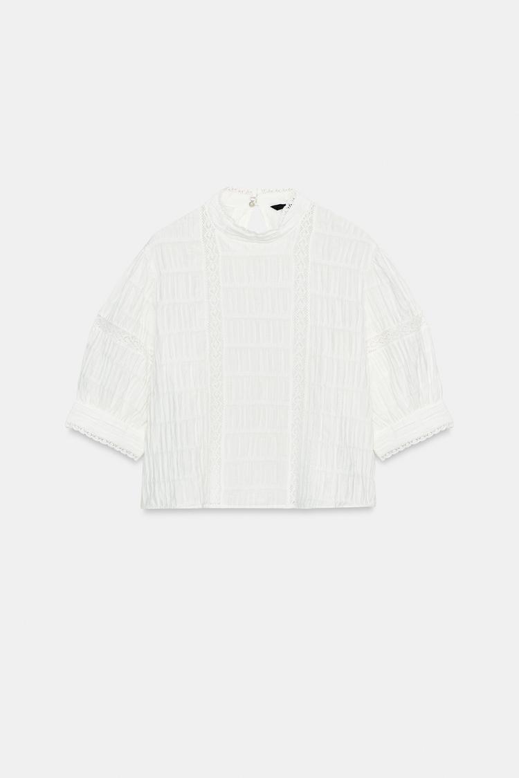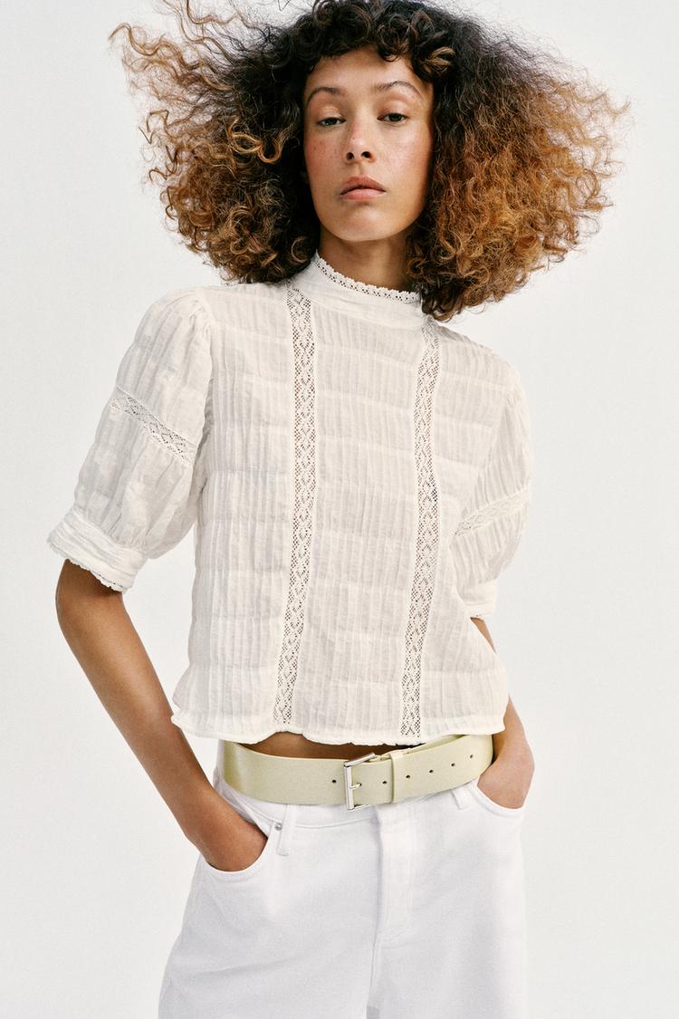 ZARA РУБАШКА С КРУЖЕВОМ И РУКАВАМИ-БУФФАМИ, БЕЛЫЙ