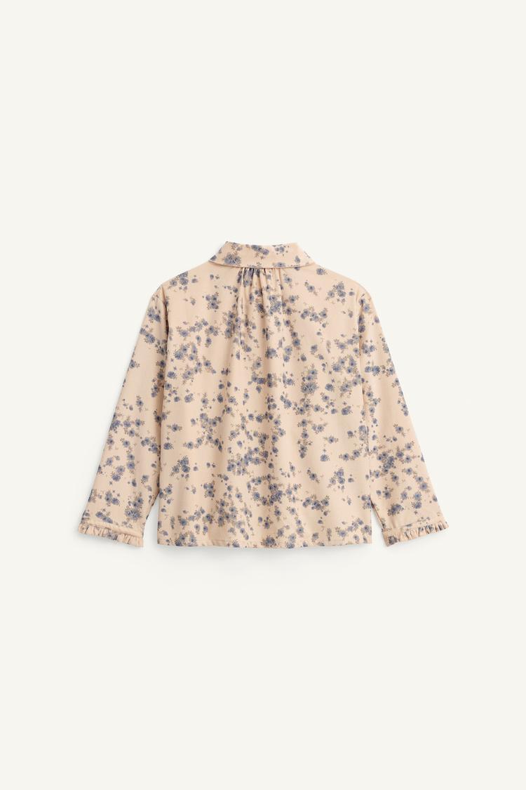 Рубашка с воротником-деталью, длинными рукавами и оборками. Передняя часть застегивается на пуговицы. Принт.