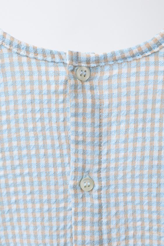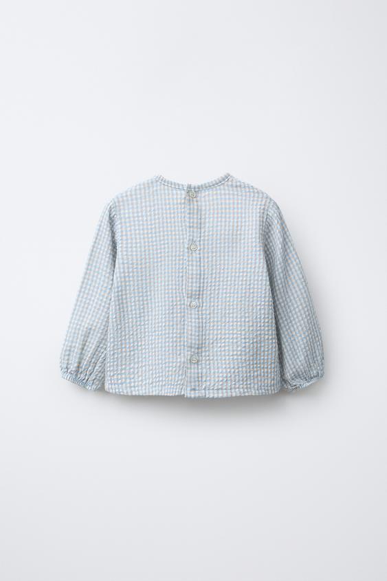 Рубашка с круглым вырезом и длинными рукавами на резинке. Застежка на пуговицы сзади. Нагрудный накладной карман. Принт в клетку.