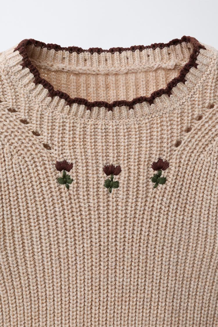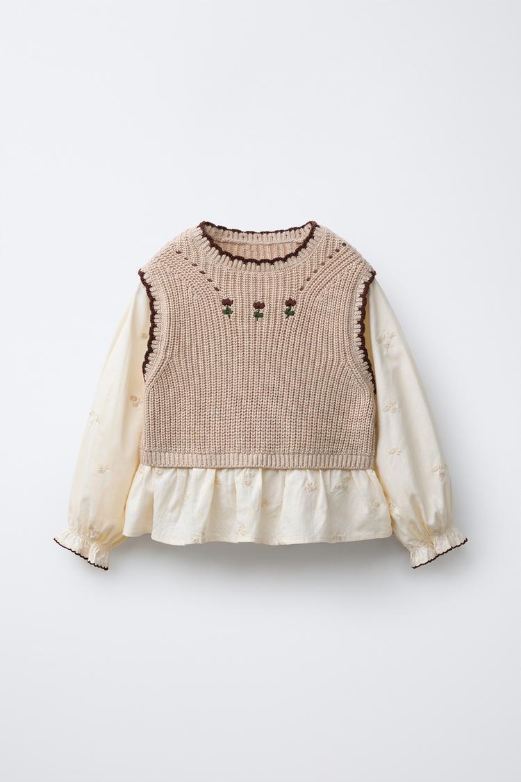 ZARA РУБАШКА С ЦВЕТОЧНОЙ ВЫШИВКОЙ И ТРИКОТАЖНЫМ ЖИЛЕТОМ, СВЕТЛО-БЕЖЕВЫЙ