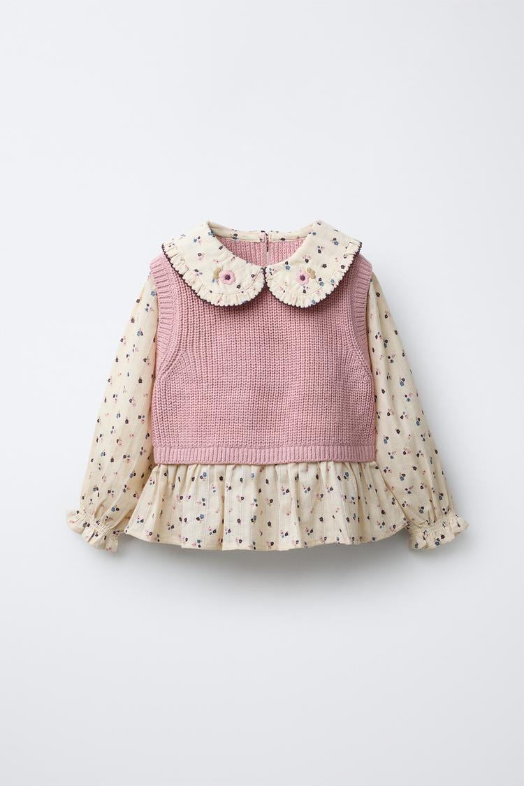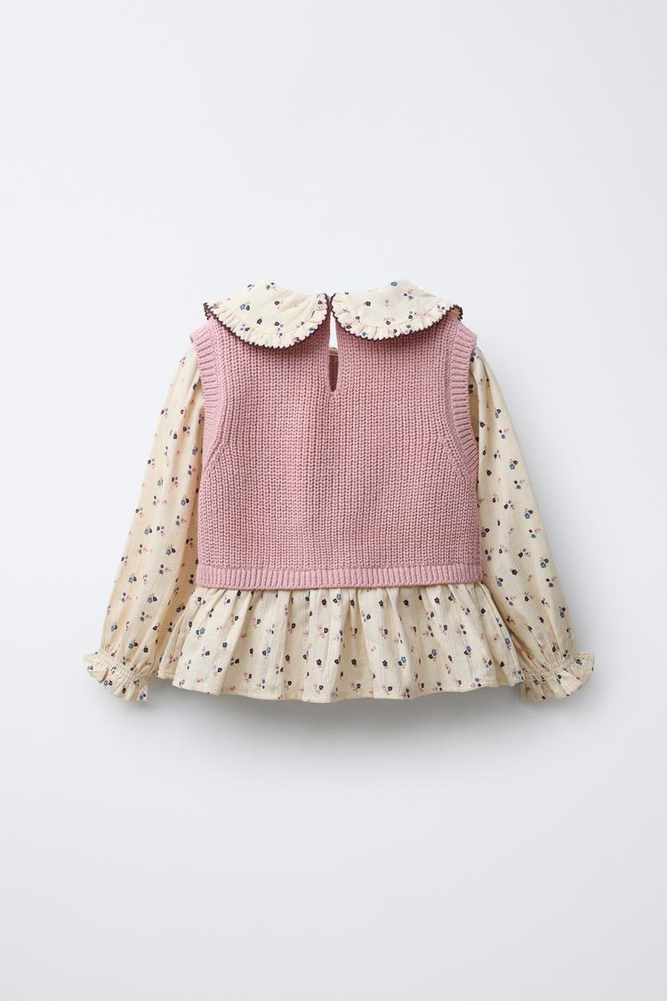 ZARA РУБАШКА С ЦВЕТОЧНЫМ ПРИНТОМ И ТРИКОТАЖНЫМ ЖИЛЕТОМ, МЯГКИЙ РОЗОВЫЙ