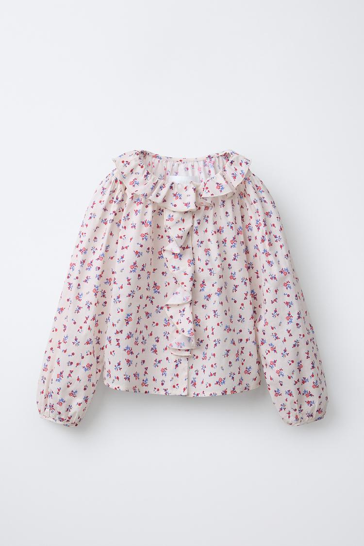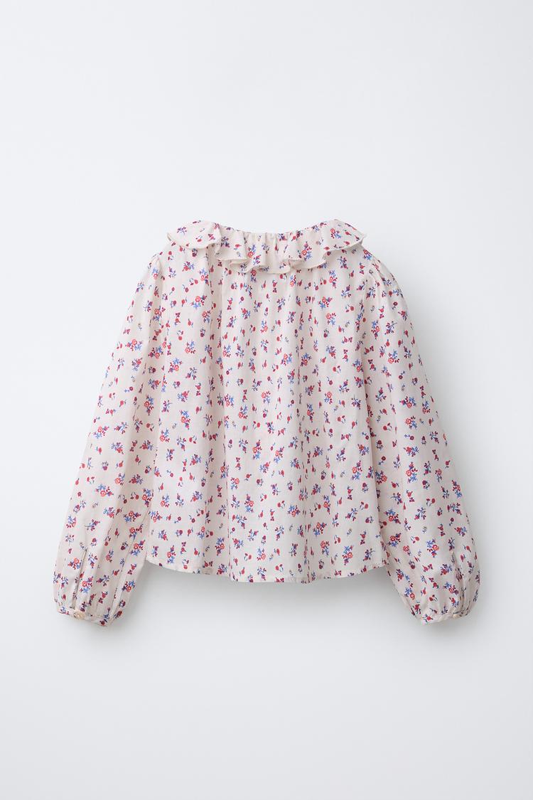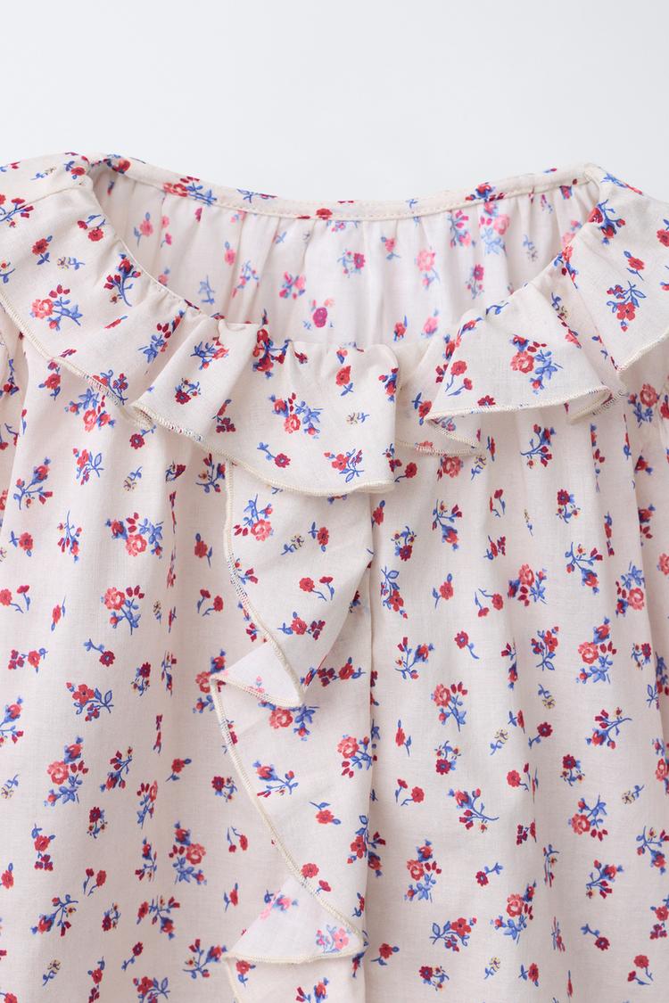 ZARA РУБАШКА С ЦВЕТОЧНЫМ ПРИНТОМ И ВОЛАНАМИ, ЭКРЮ/КРАСНЫЙ