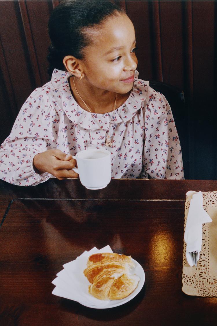 Рубашка с круглым воротником и длинными рукавами с манжетами. Застежка скрыта планкой. Спереди отделка в виде воланов. Цветочный принт.