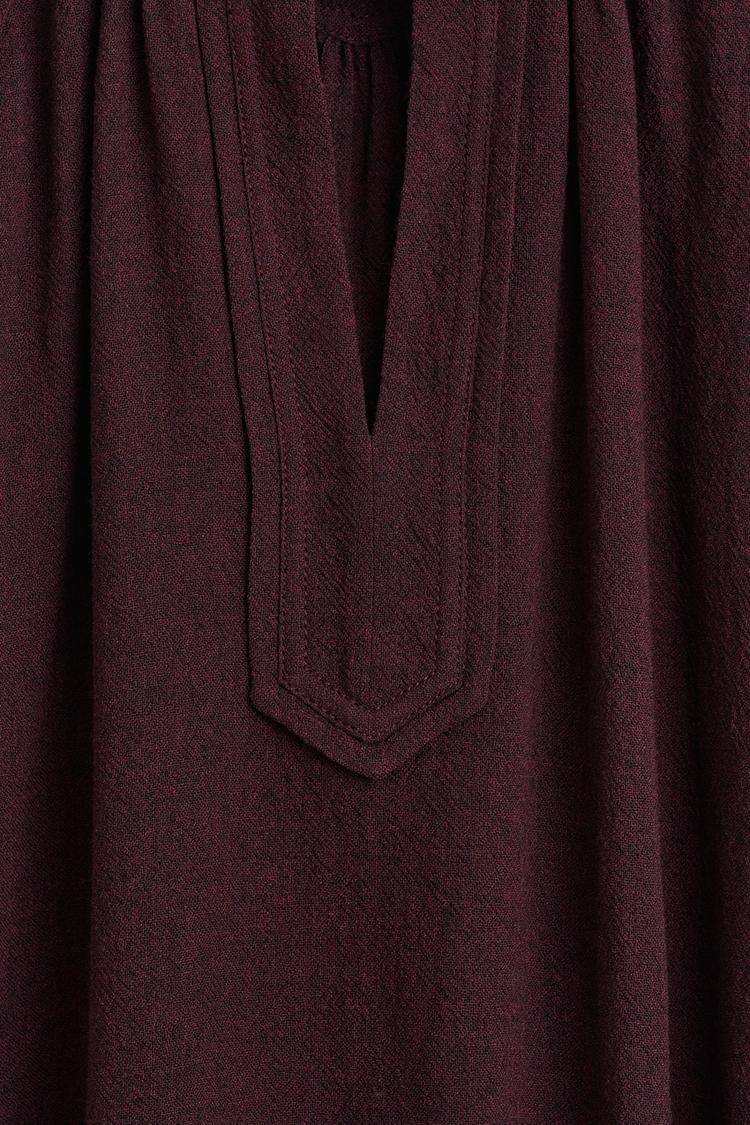 Рубашка из 29% вискозы и шерстяной смеси. Воротник-лодочка с завязками из той же ткани. Длинные рукава с манжетами. Прямой крой.