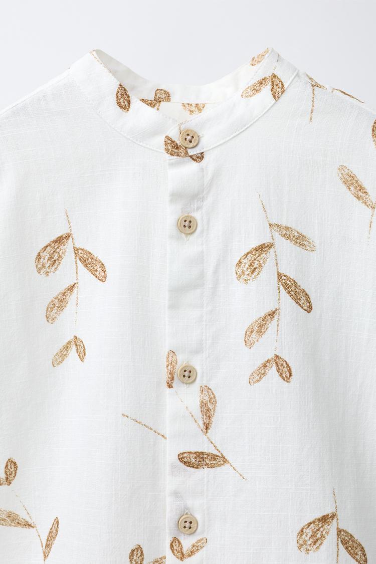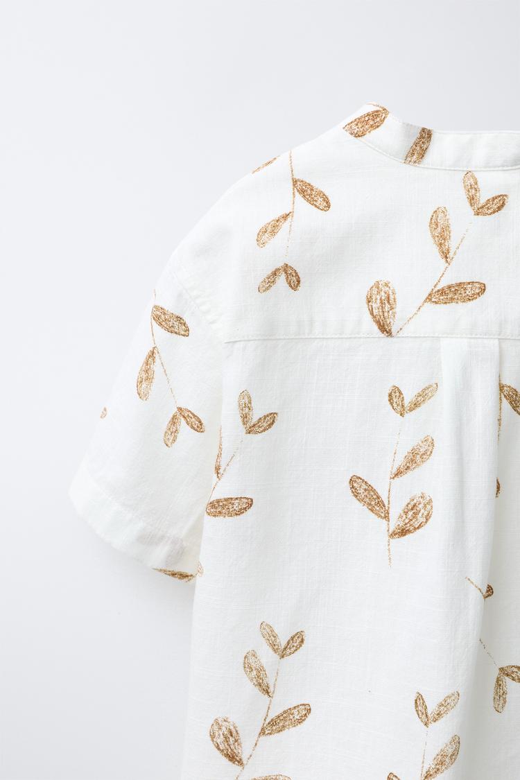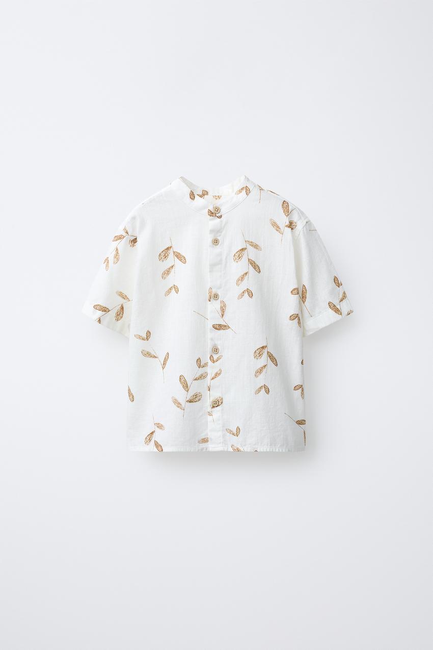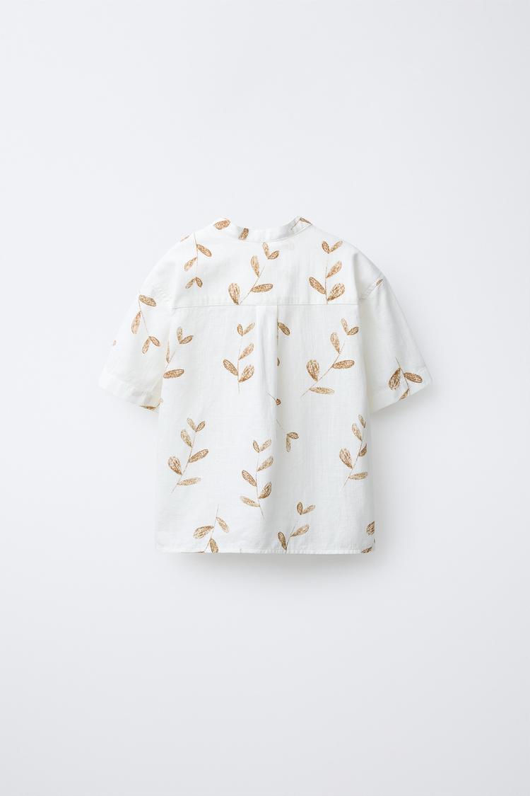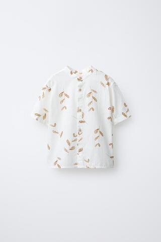 ZARA РУБАШКА С ВОРОТНИКОМ-СТОЙКОЙ И ПРИНТОМ «ЛИСТЬЯ», СВЕТЛО-БЕЖЕЫЙ