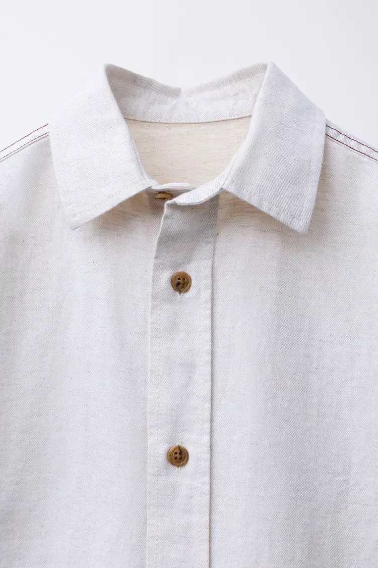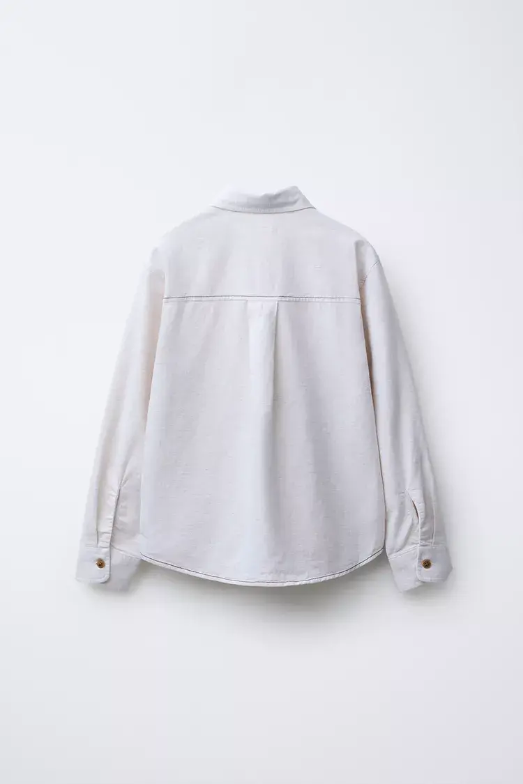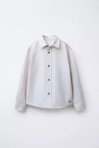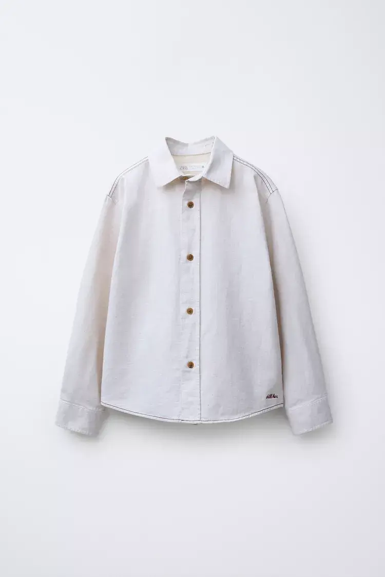 ZARA РУБАШКА С ВЫШИТОЙ НАДПИСЬЮ ИЗ ХЛОПКА И ЛЬНА, ЭКРЮ