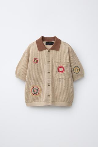 Вязаная рубашка с воротником и короткими рукавами. Застежка на пуговицы спереди. Нагрудный накладной карман с вышивкой.