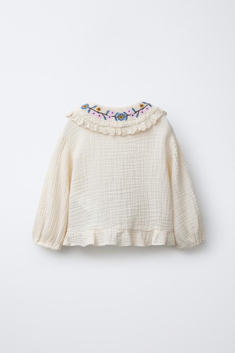 ZARA РУБАШКА С ВЫШИВКОЙ «ЦВЕТЫ», ЭКРЮ