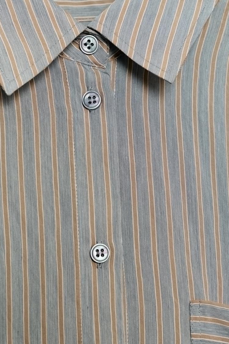 Рубашка свободного кроя с воротником и длинными рукавами. Манжеты, накладной карман спереди. Закругленный низ. Застегивается на пуговицы.