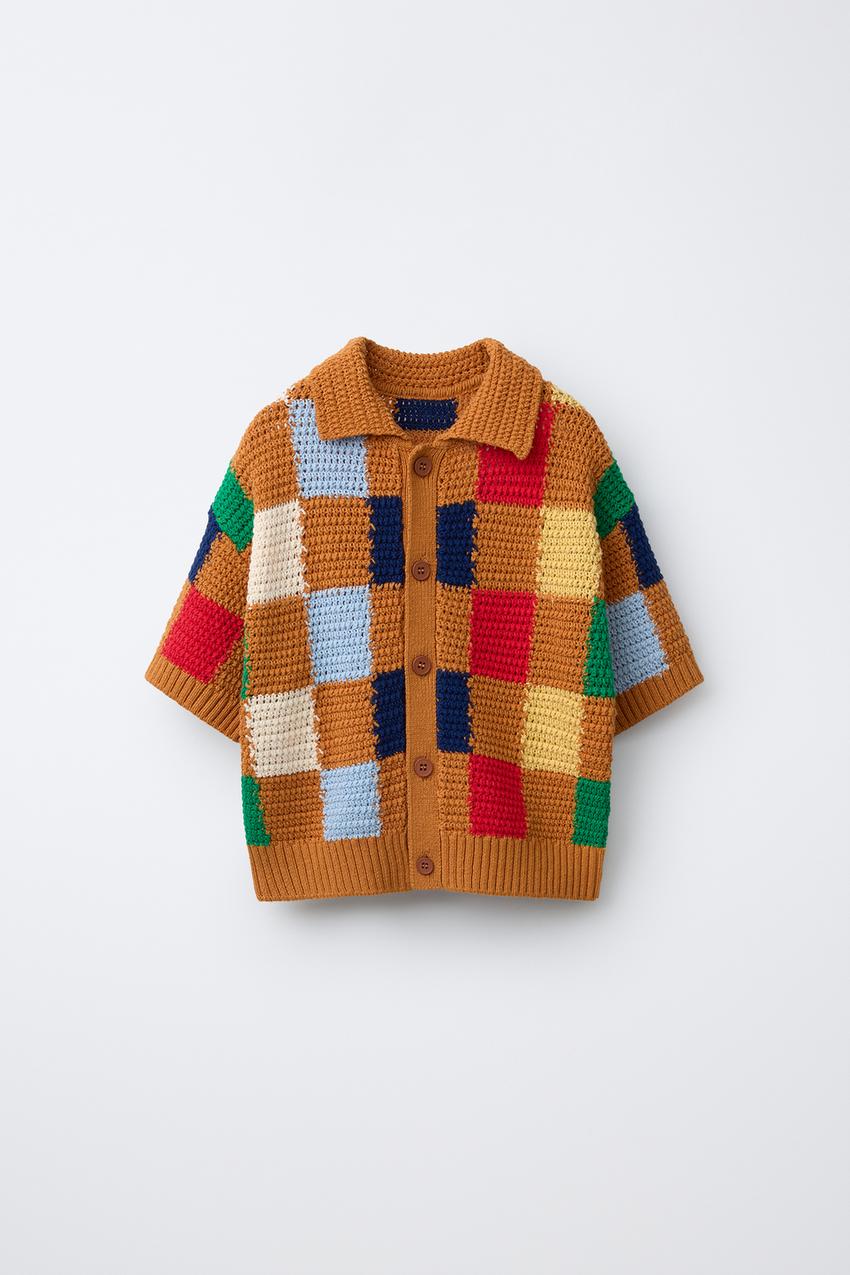 Вязаная рубашка с воротником и короткими рукавами. Застежка на пуговицы спереди. Принт в клетку.