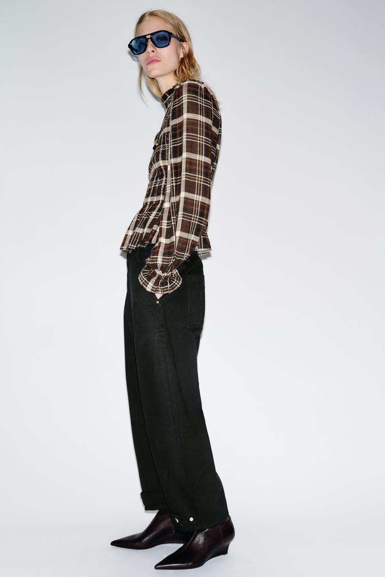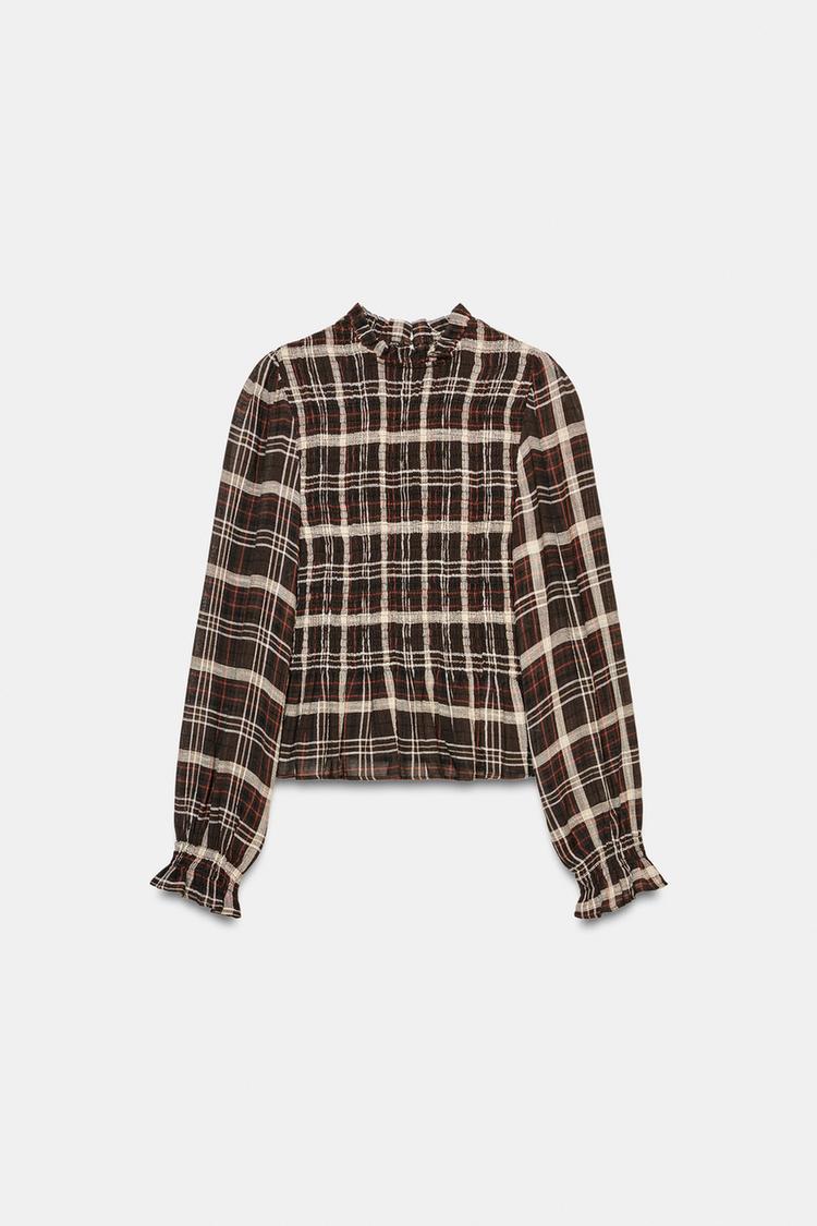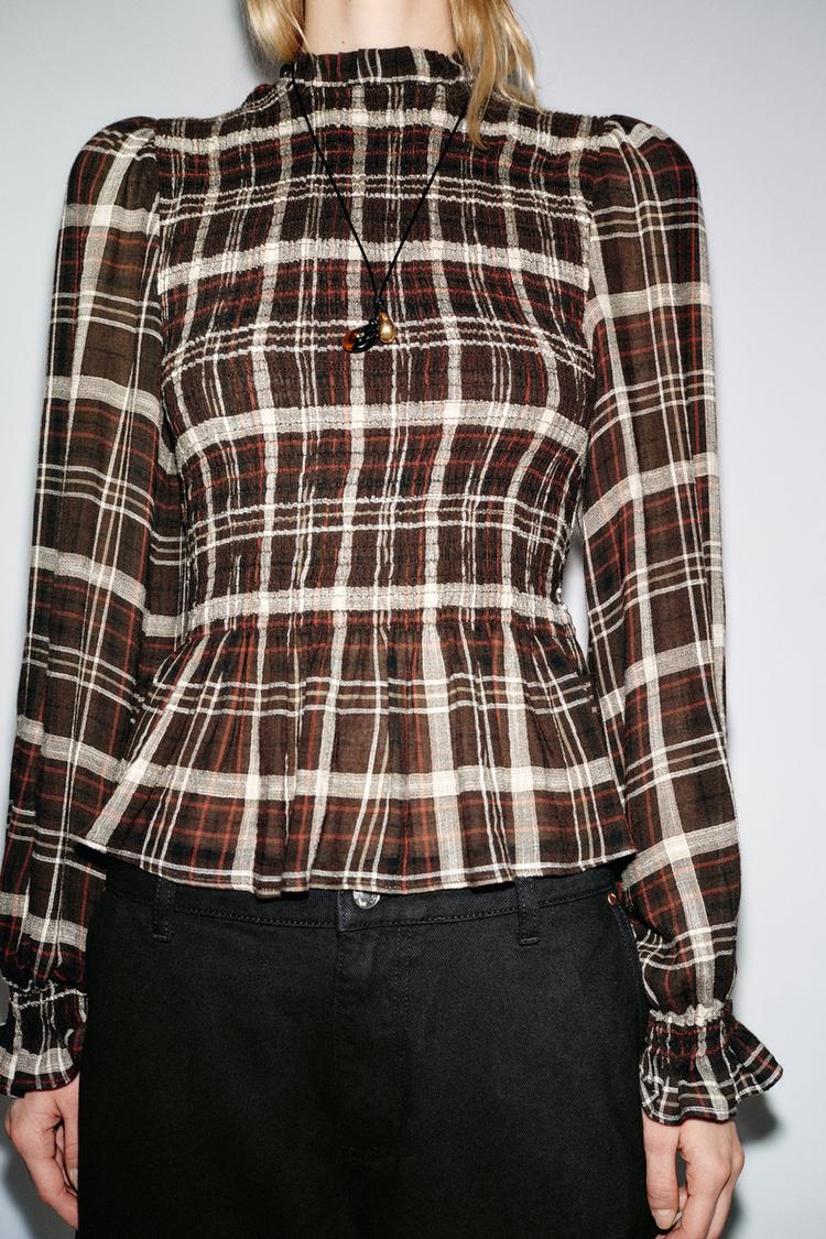 ZARA РУБАШКА В КЛЕТКУ С ЭЛАСТИЧНЫМ ЖАТЫМ УЗОРОМ, КОРИЧНЕВЫЙ/ЭКРЮ