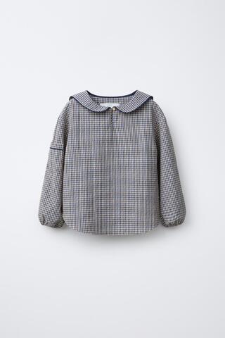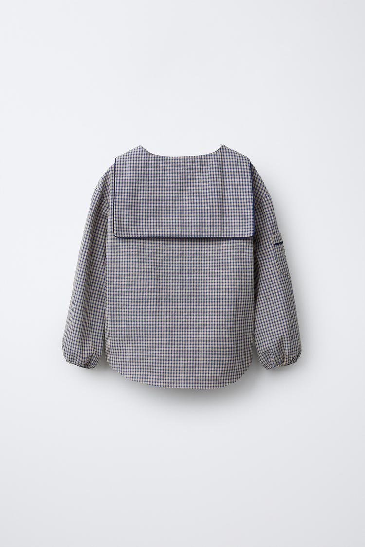 ZARA РУБАШКА В КЛЕТКУ С КРУГЛЫМ ВОРОТНИКОМ, ЭКРЮ/СИНИЙ