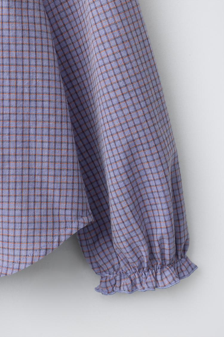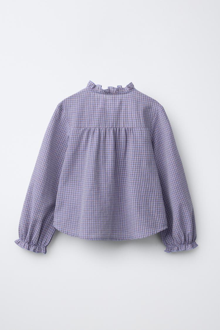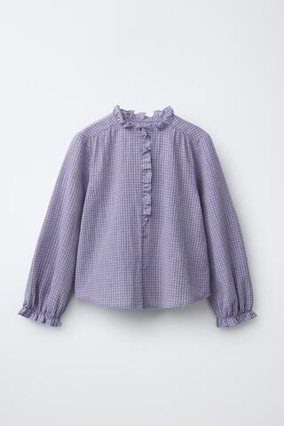 Рубашка с воротником-стойкой и длинными рукавами на резинке. Воланы и принт в мелкую клетку.