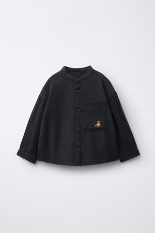 Рубашка с воротником-стойкой и длинными рукавами на пуговицах. Застежка на пуговицах спереди. Нагрудный накладной карман с вышитым узором.