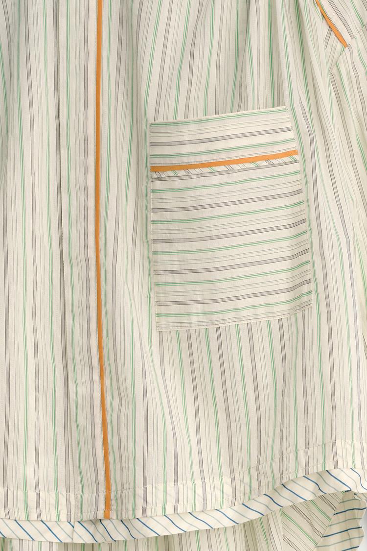 Рубашка из смеси хлопка и других волокон. С круглым вырезом горловины и длинными рукавами с манжетами. Накладной карман на груди. Деталь с контрастной окантовкой. Асимметричный подол. Скрытая застёжка на пуговицах спереди.