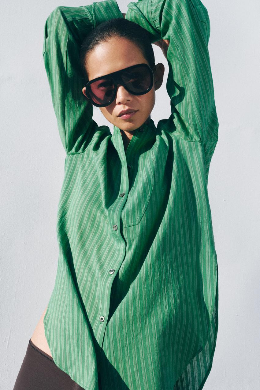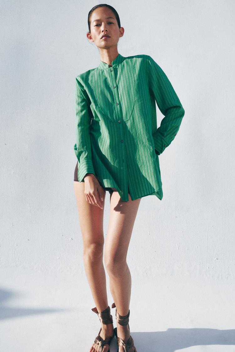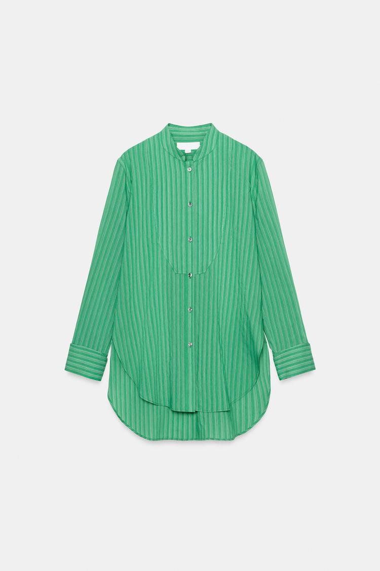 ZARA РУБАШКА В ПОЛОСКУ С НАГРУДНИКОМ — ZW COLLECTION, ЗЕЛЕНЫЙ