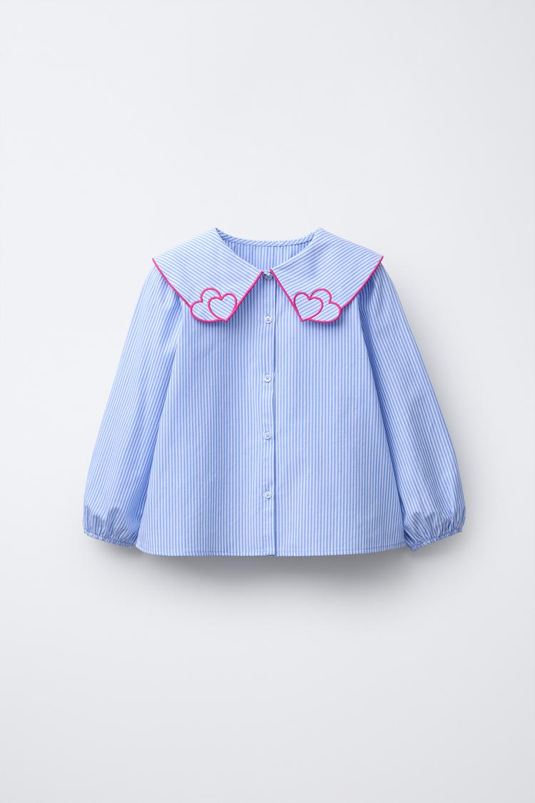 ZARA РУБАШКА В ПОЛОСКУ С ВОРОТНИКОМ В ВИДЕ СЕРДЕЦ, СИНИЙ