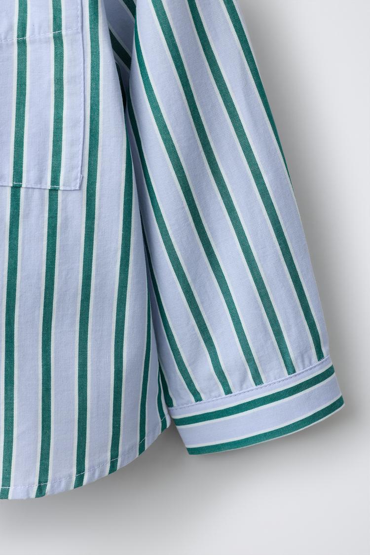 Рубашка с отложным воротником и длинными рукавами. Застежка на пуговицы спереди. Нагрудный накладной карман. Принт в полоску.