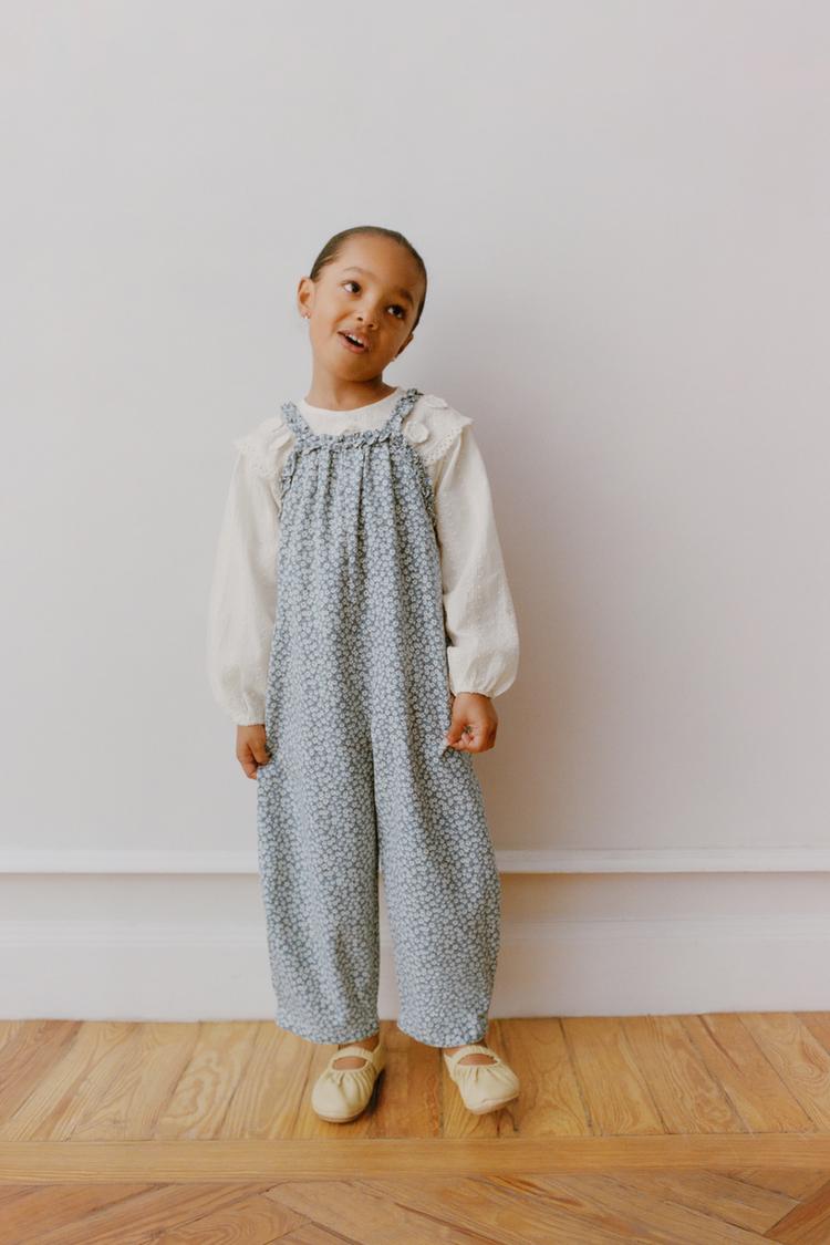 Рубашка с круглым воротником и длинными рукавами на резинке. Каплевидный вырез с пуговицей сзади. Детали с вышивкой.