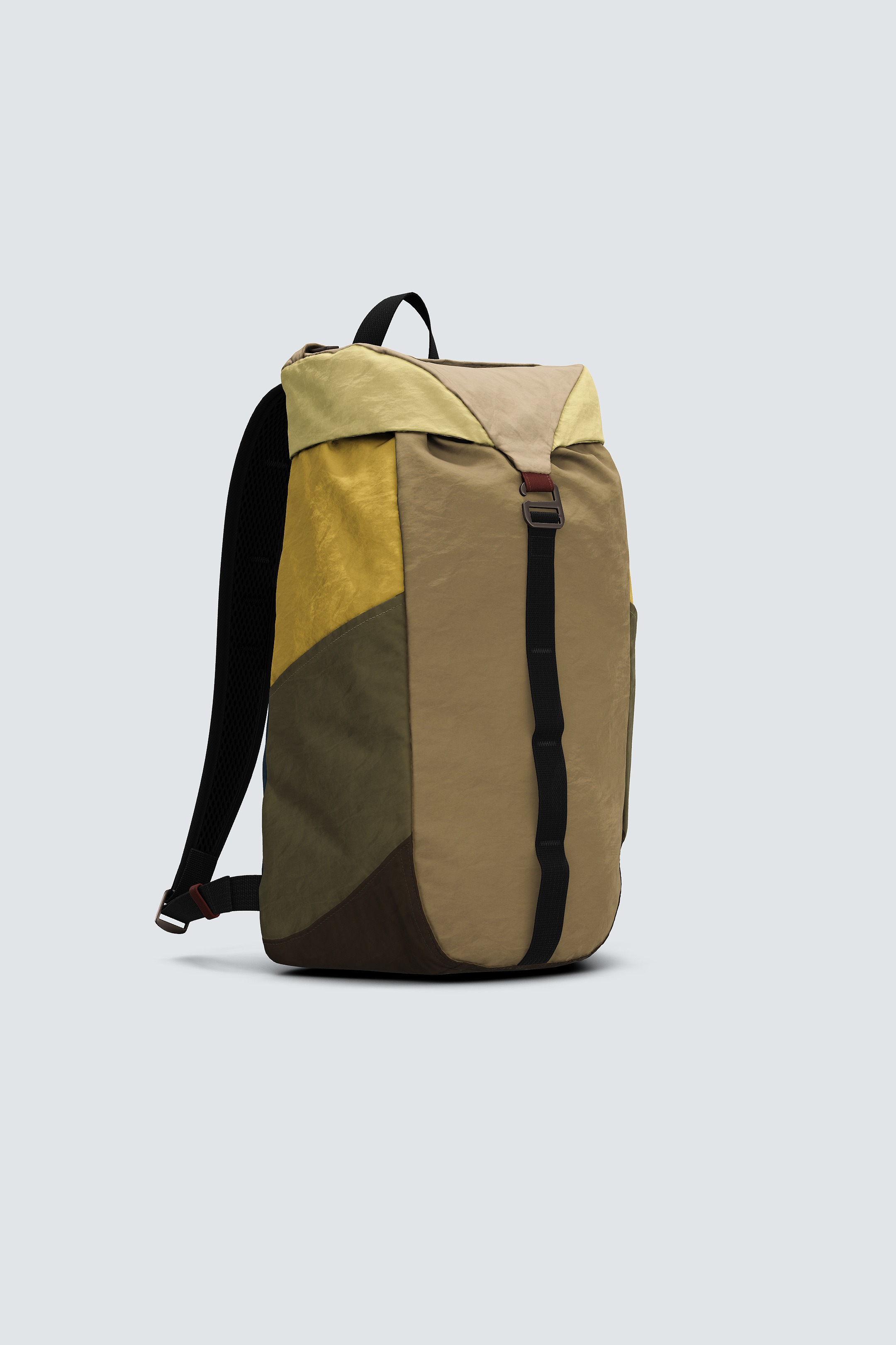 Рюкзак из технической ткани с кожаными деталями. Основное отделение закрывается клапаном с пряжкой и затягивающимся шнурком. Внутри — плоский карман. По бокам расположены два плоских кармана. Ручка и две регулируемые лямки с лентой и пряжкой быстрого сброса для фиксации рюкзака на теле.
